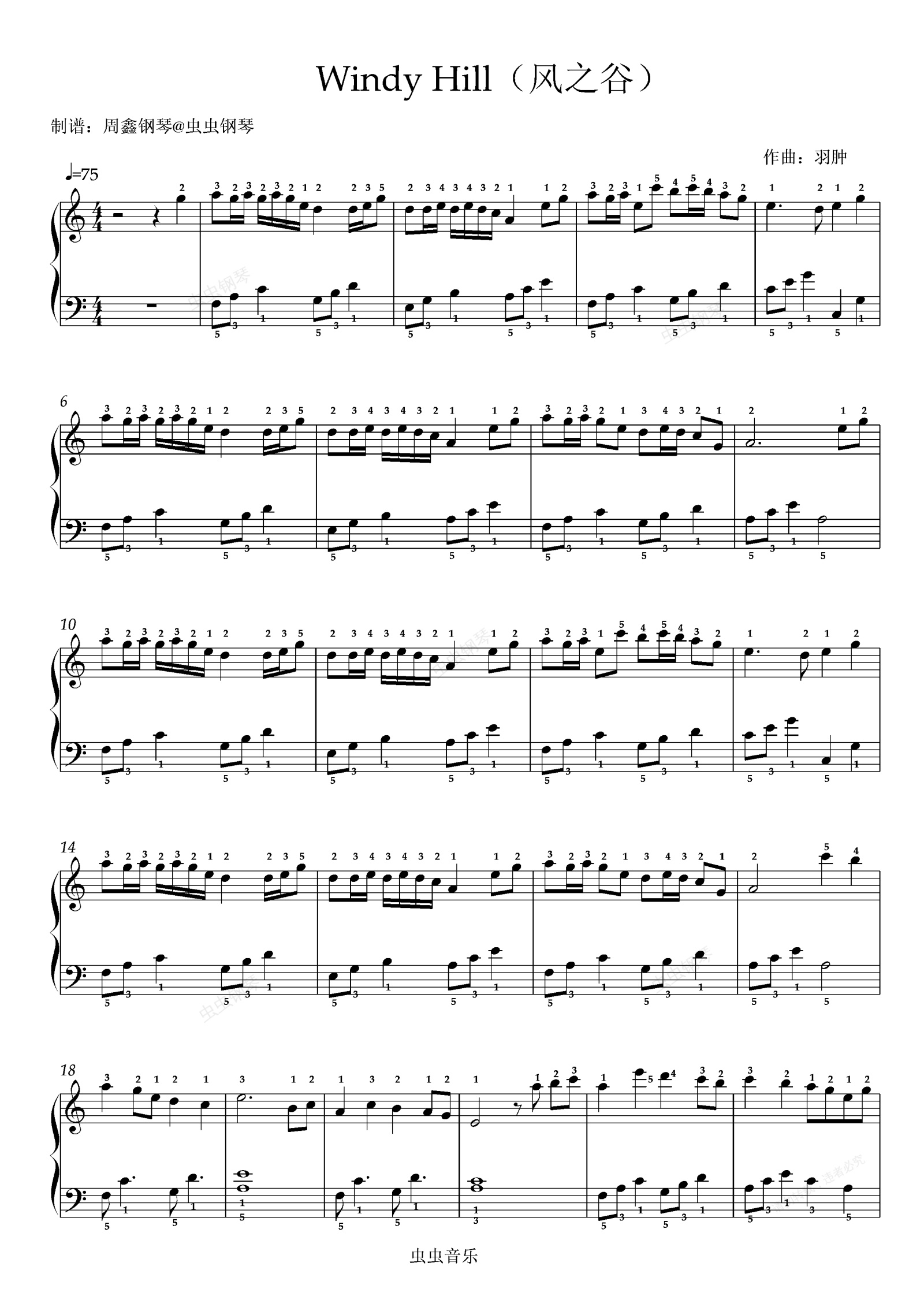 钢琴谱:《Windy Hill(风之谷)》C调 带指法
