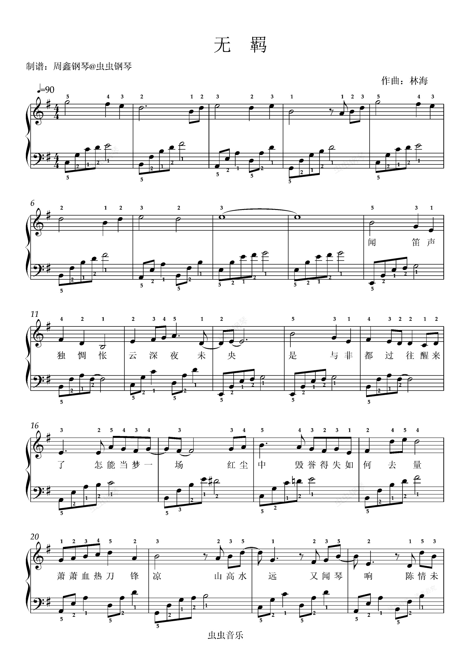 钢琴谱:《无羁》G调 带指法 带歌词 简单版