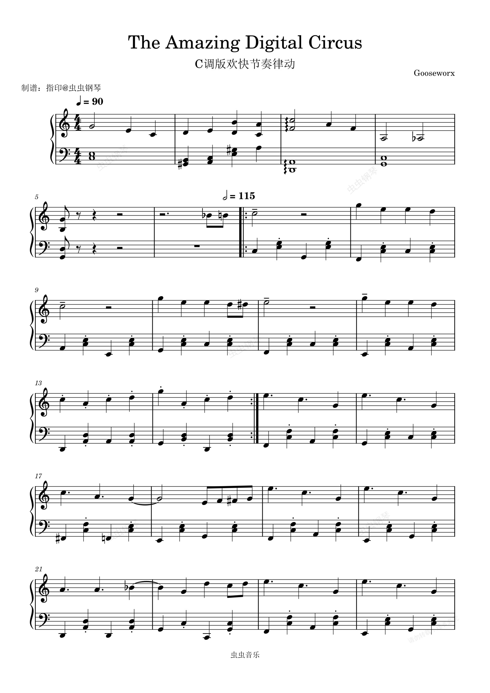 钢琴谱:C调版欢快节奏《The Amazing Digital Circus》