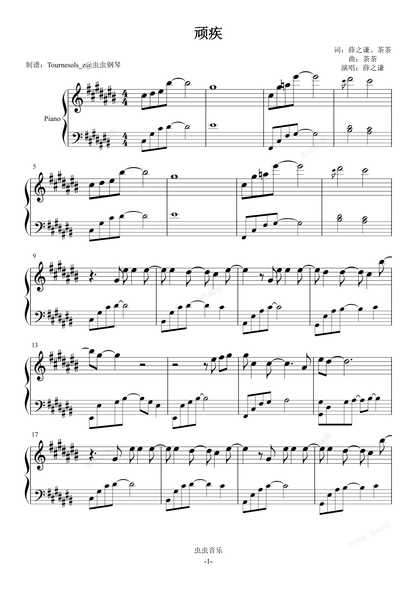 钢琴谱:顽疾(原调,薛之谦,《音乐缘计划第二季》第1期)