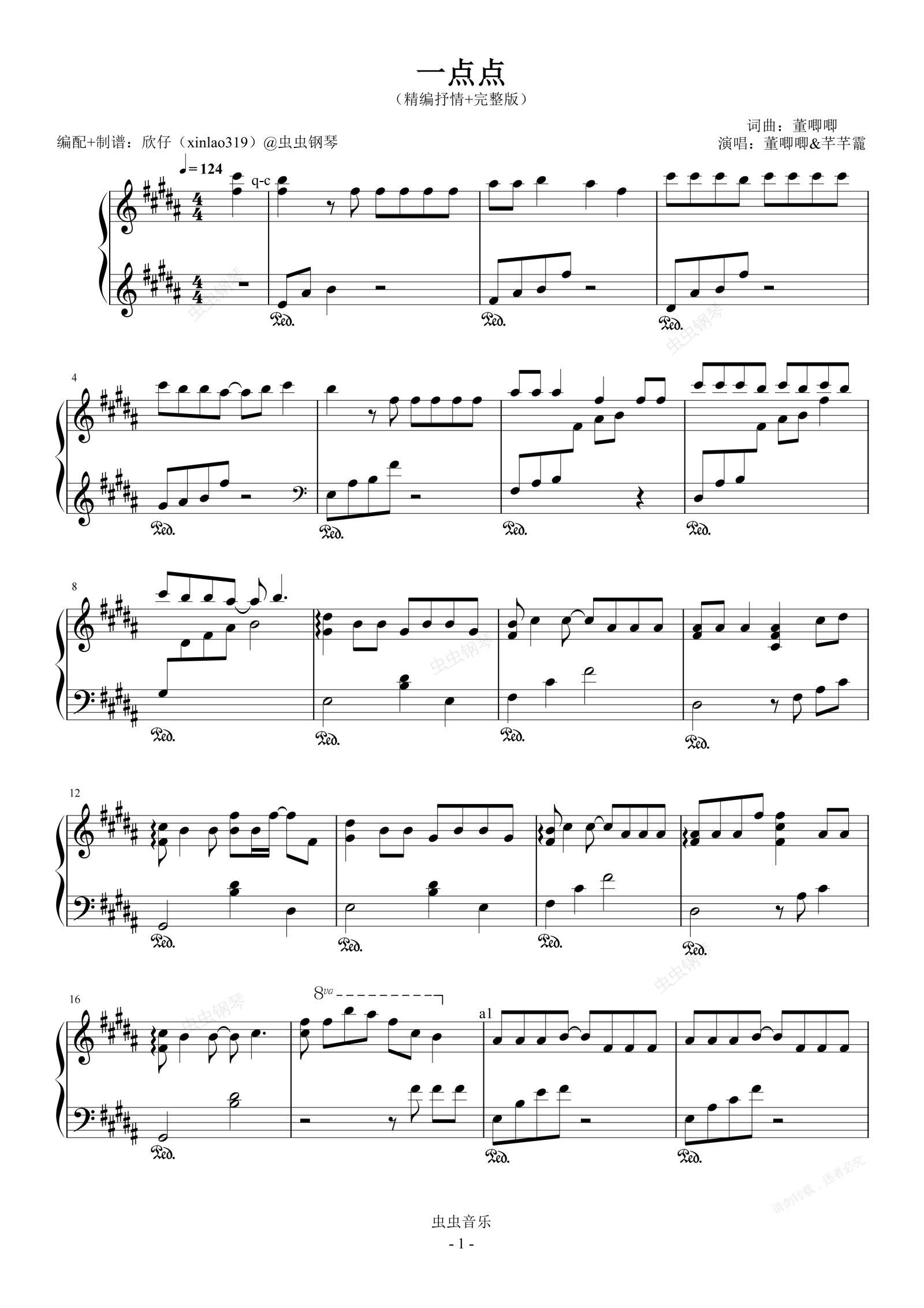 钢琴谱:一点点(原调B、精编抒情+完整版)