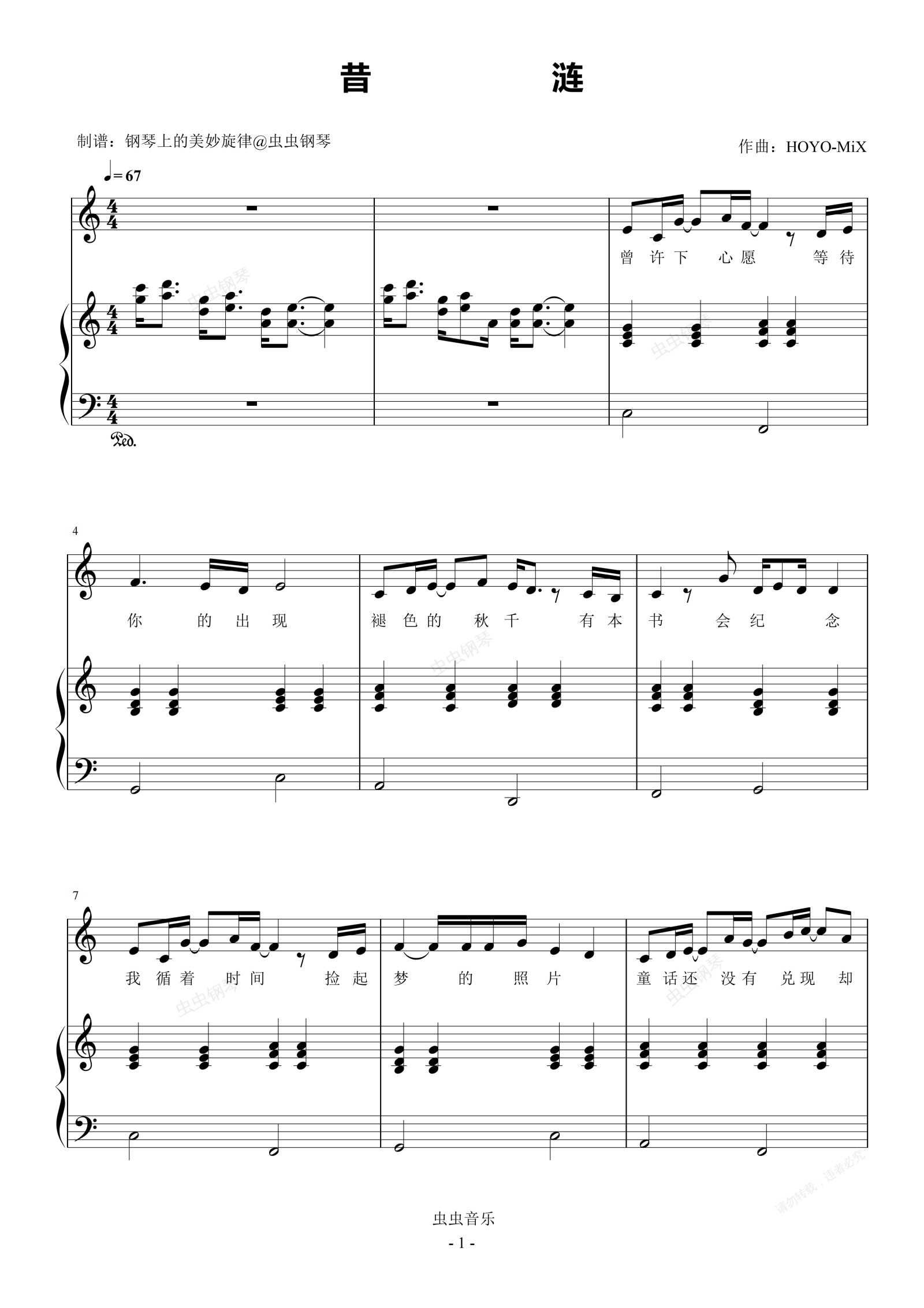 钢琴谱:昔涟 C调简易钢琴弹唱伴奏 带歌词 张韶涵