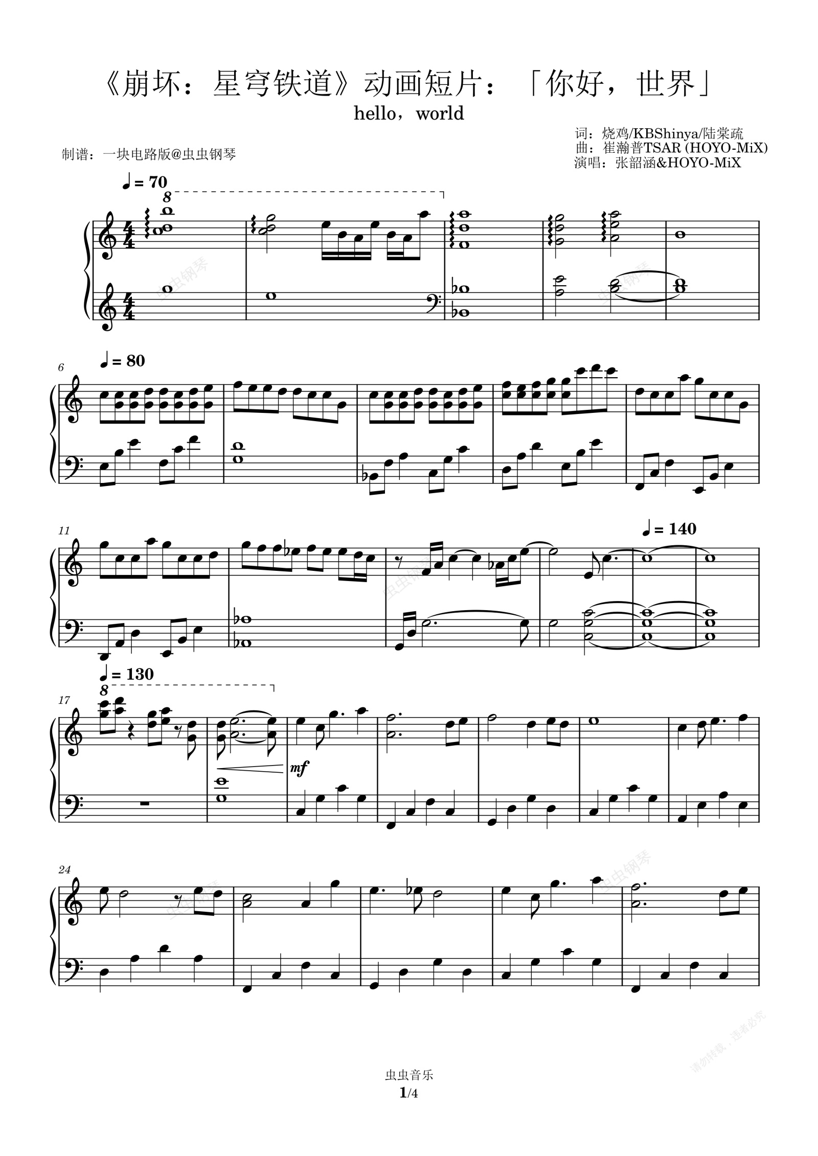 钢琴谱:《崩坏:星穹铁道》动画短片:「你好,世界」BGM(C调版)