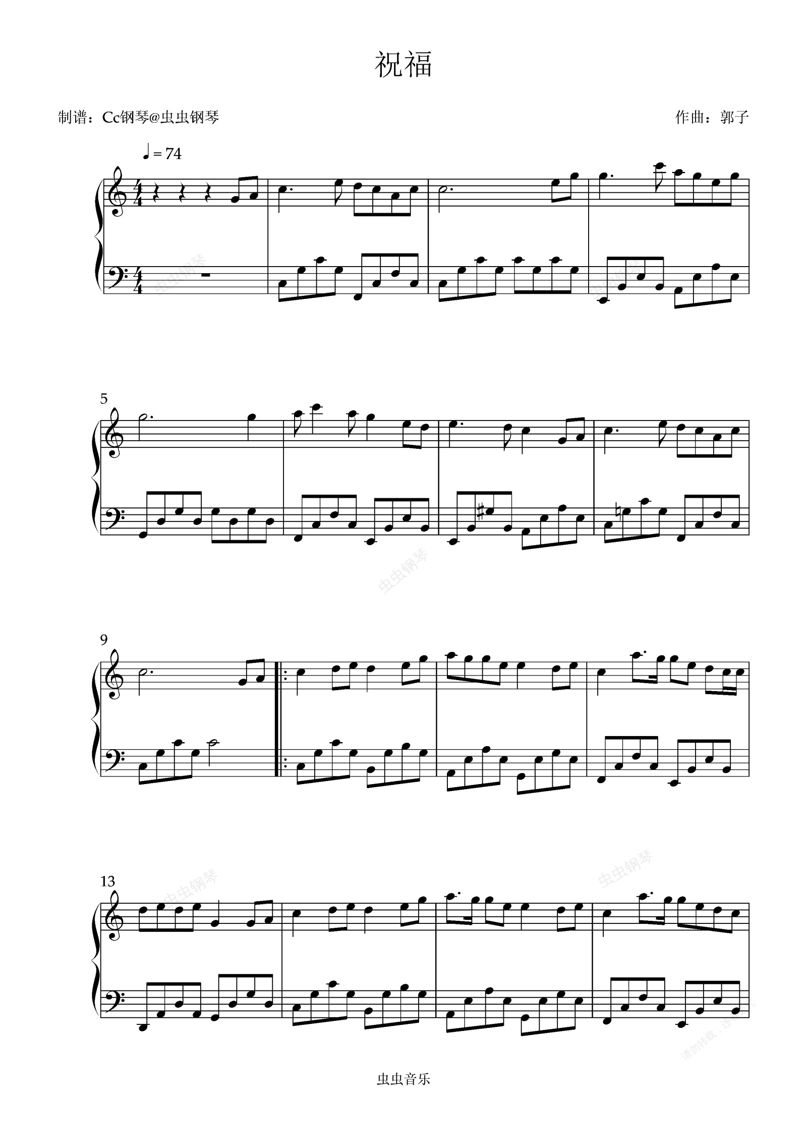 钢琴谱:祝福 C调 好听易上手