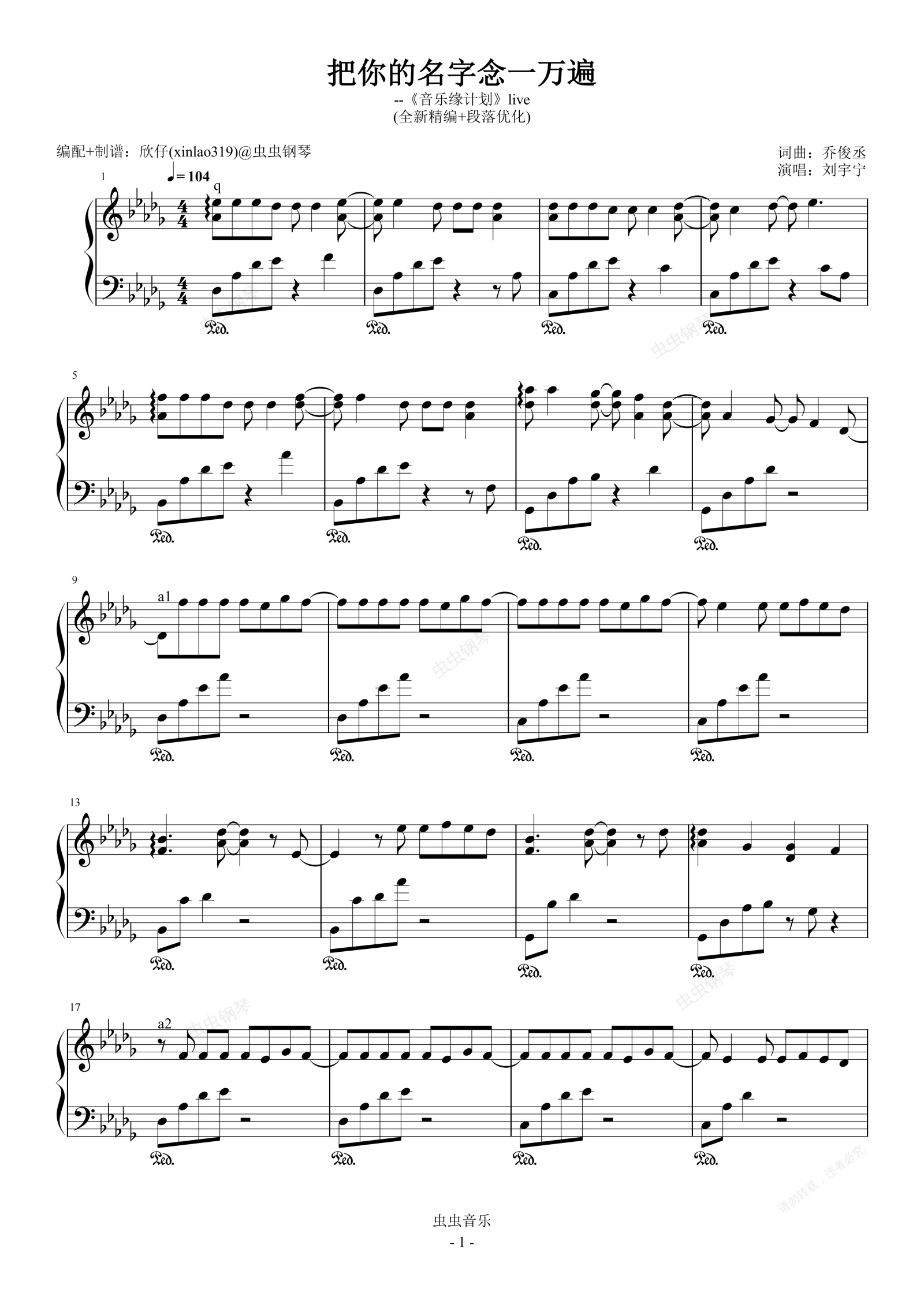 钢琴谱:把你的名字念一万遍(原调降D、刘宇宁《音乐缘计划》live、段落优化)