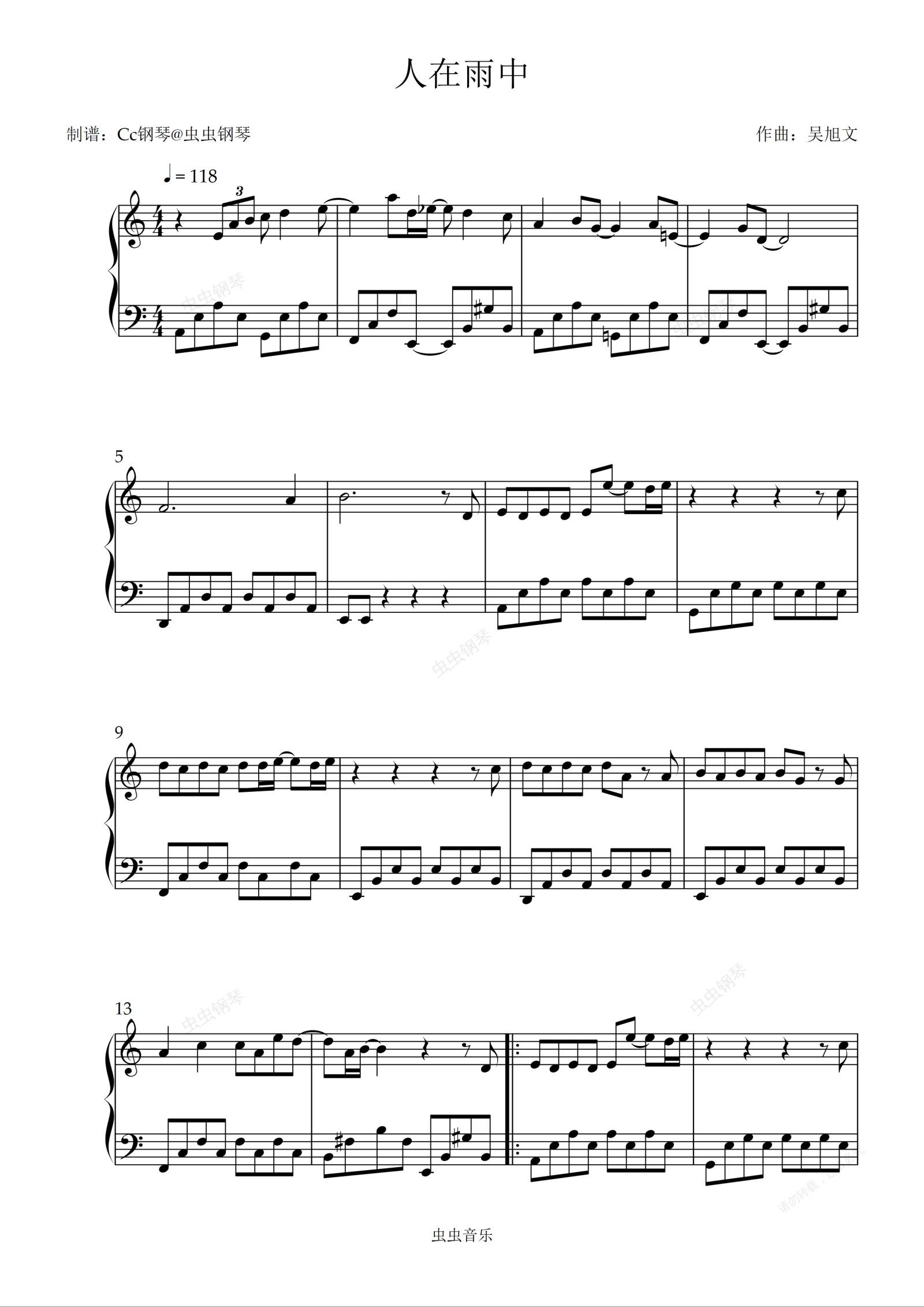 钢琴谱:人在雨中 C调 好听易上手