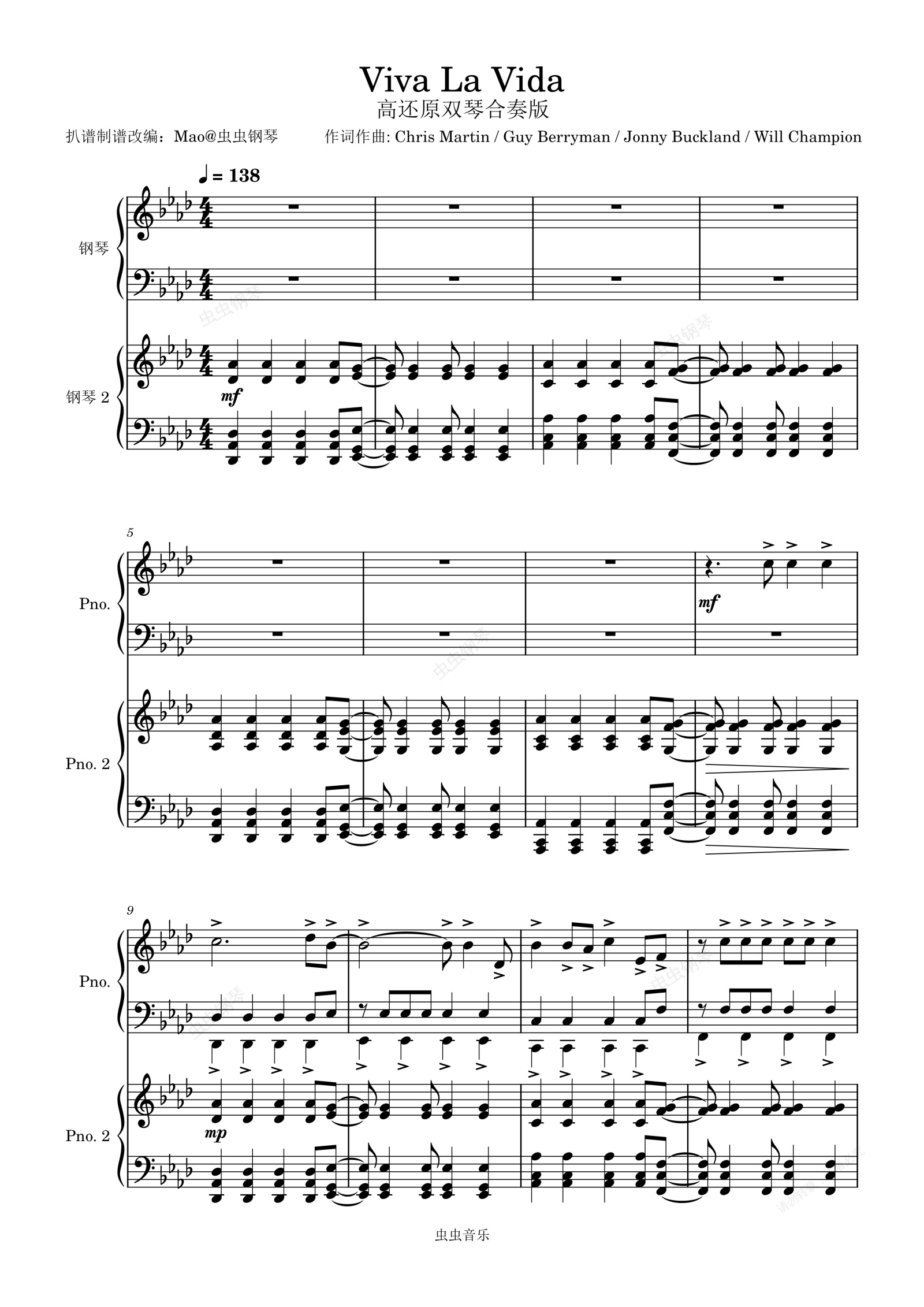 钢琴谱:Viva La Vida高还原双琴合奏版