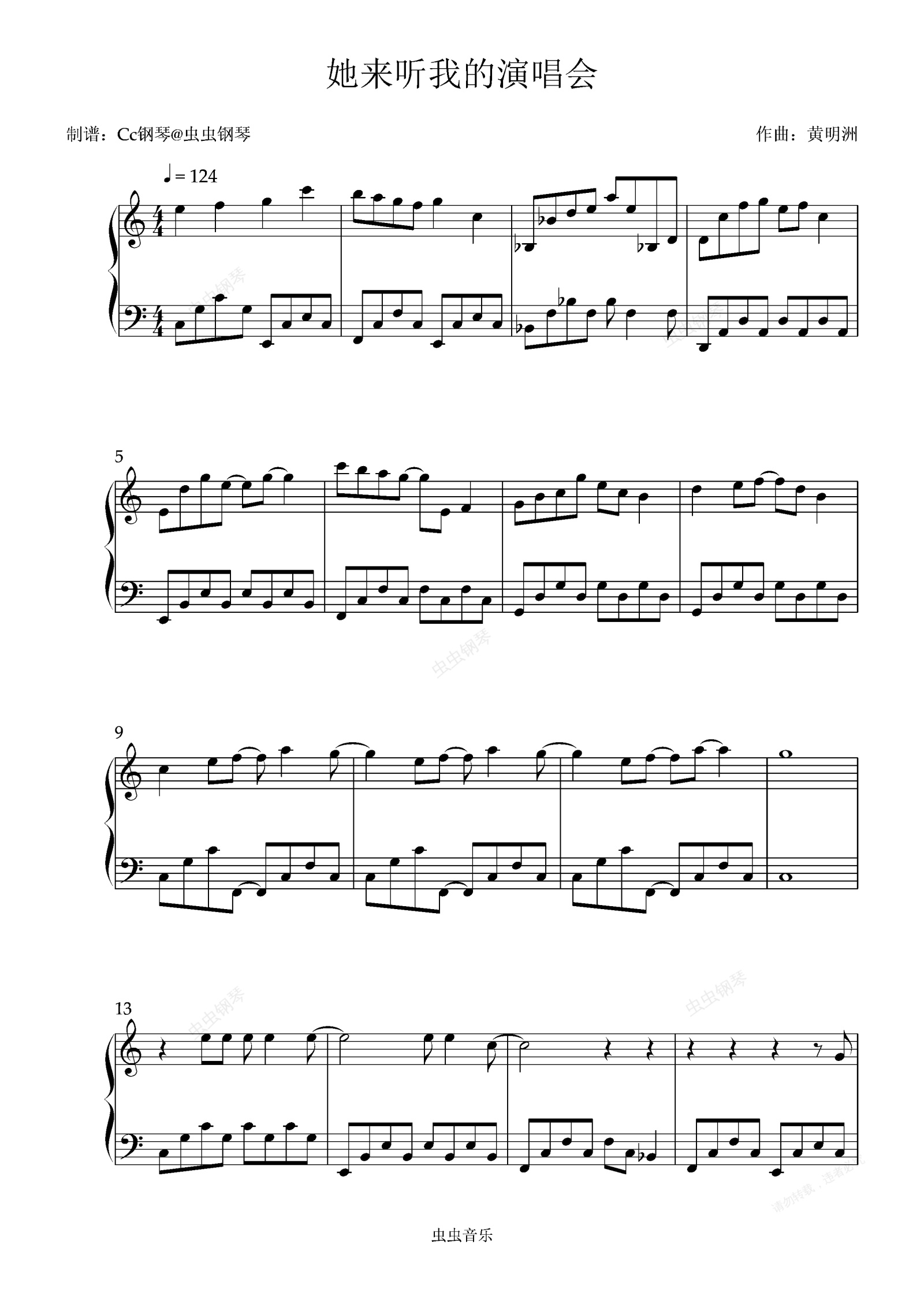 钢琴谱:她来听我的演唱会 C调 好听易上手