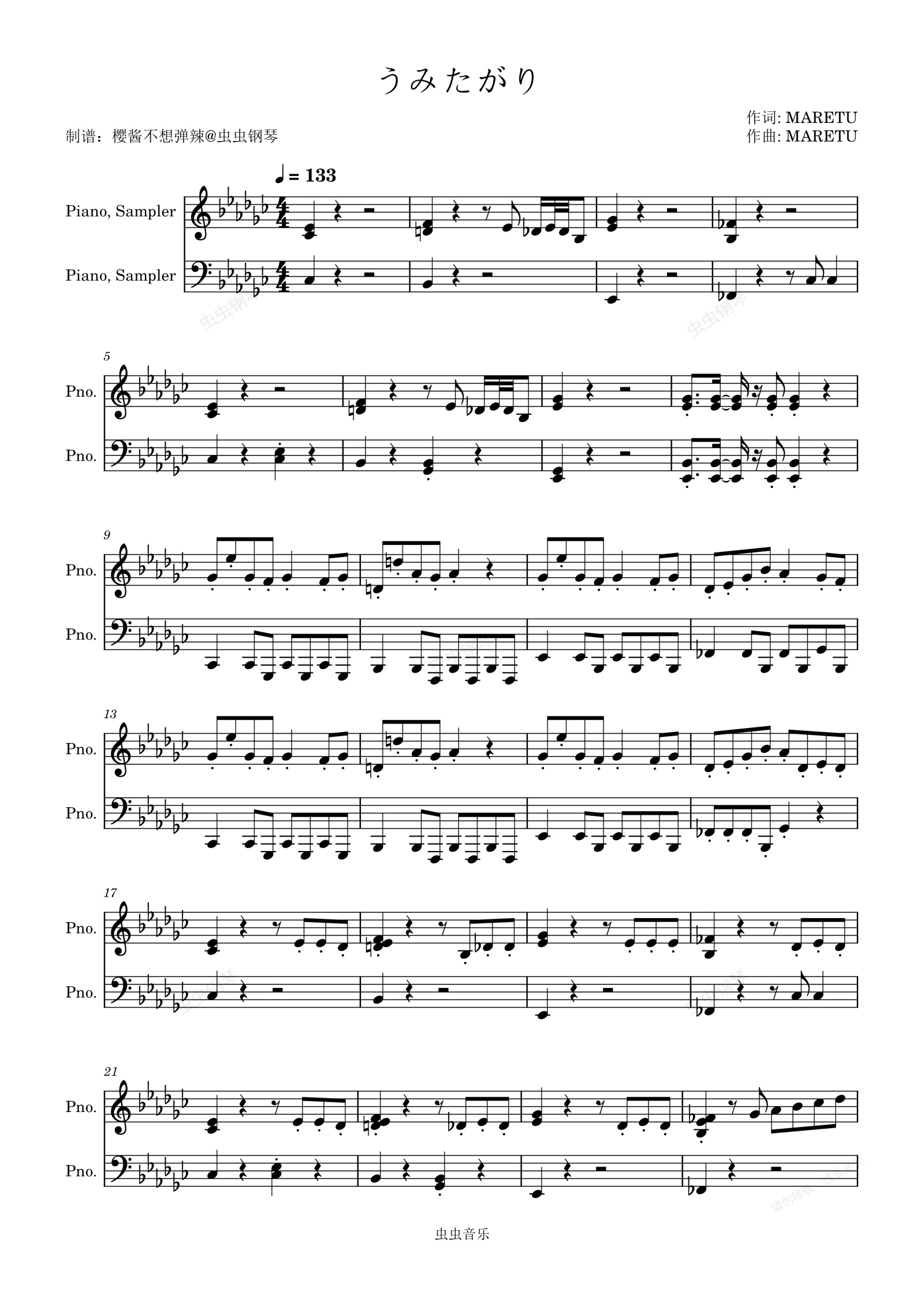钢琴谱:うみたがり (渴望诞生)MARETU/初音ミク
