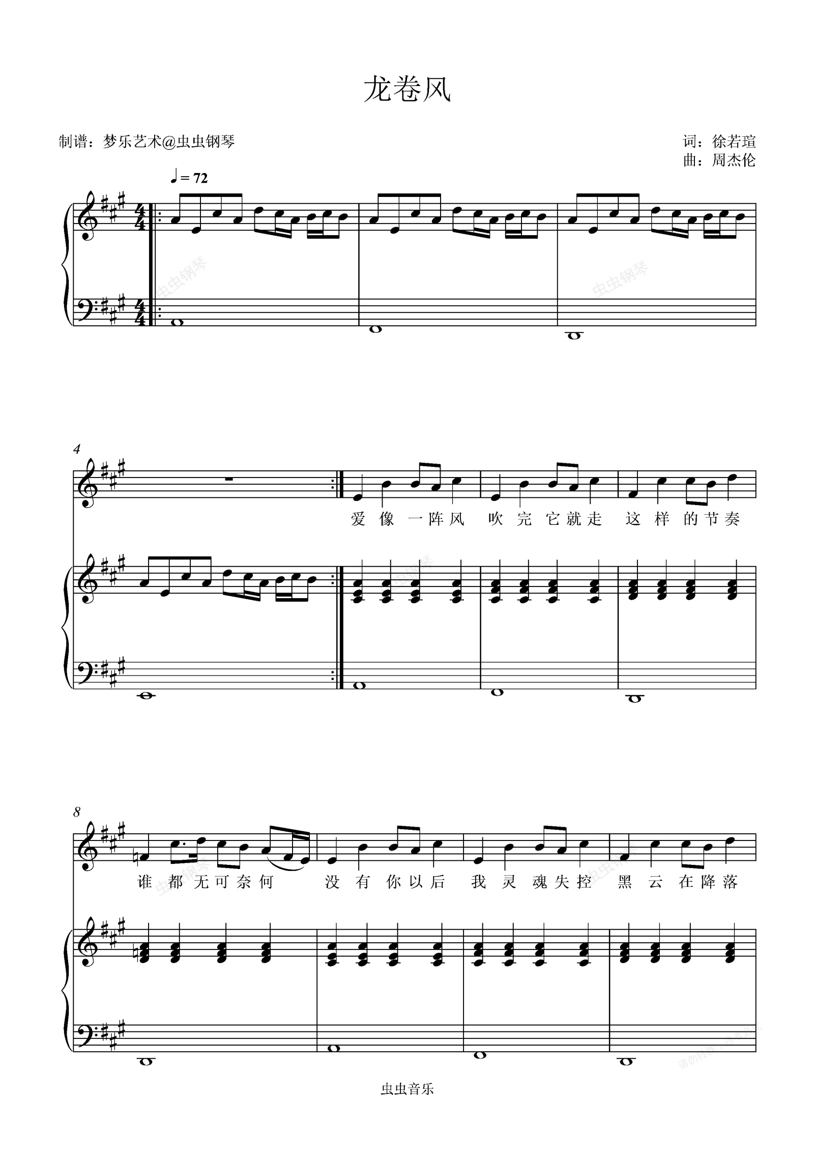 钢琴谱:《龙卷风》周杰伦 和弦弹唱版