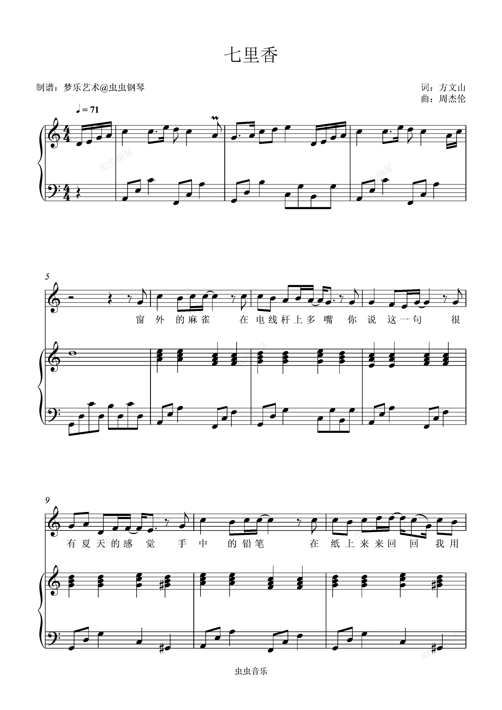 钢琴谱:《七里香》周杰伦 和弦弹唱版