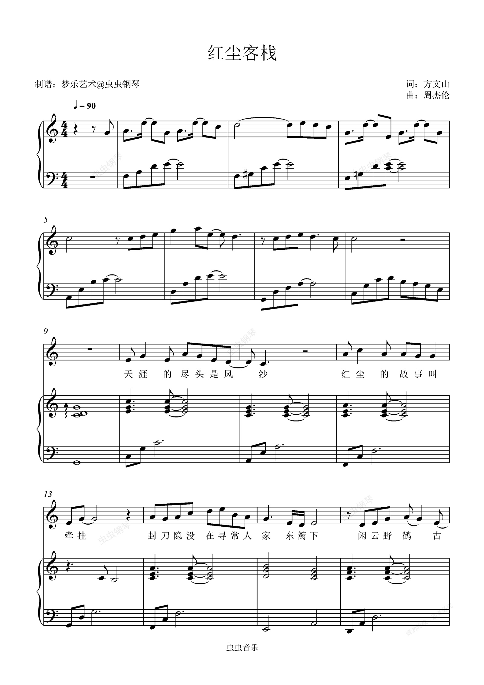 钢琴谱:《红尘客栈》周杰伦 和弦弹唱版
