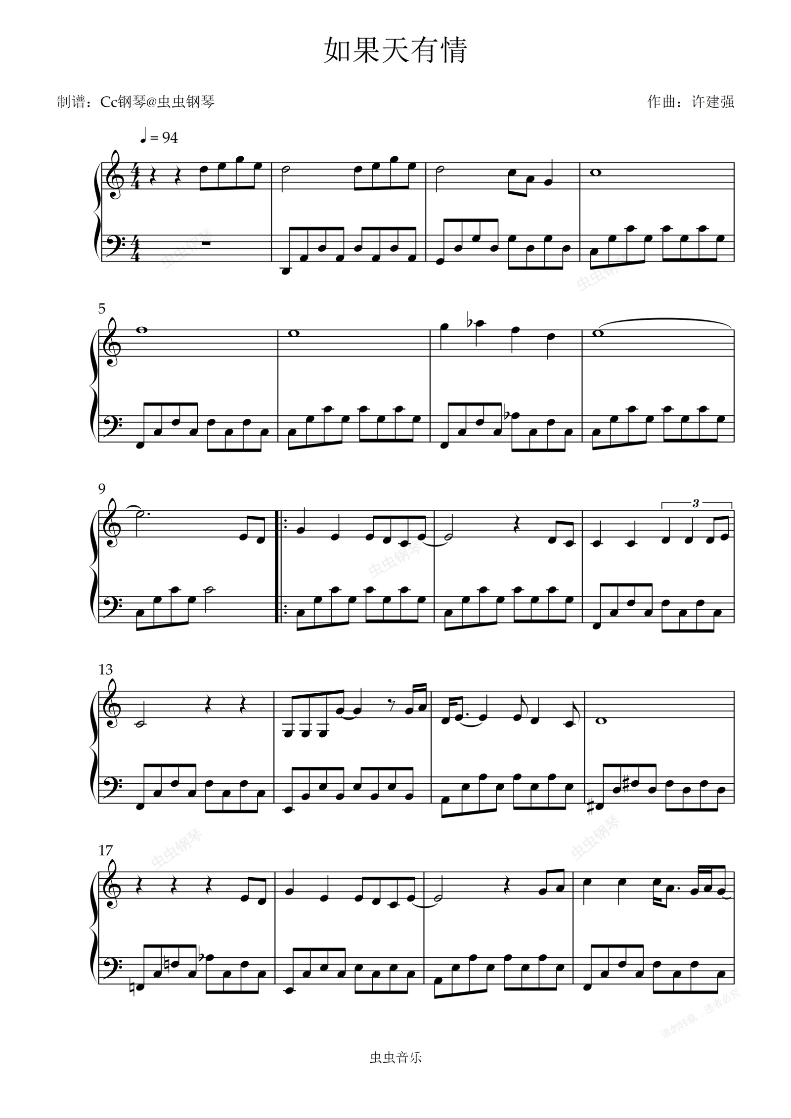 钢琴谱:如果天有情 C调 好听易上手