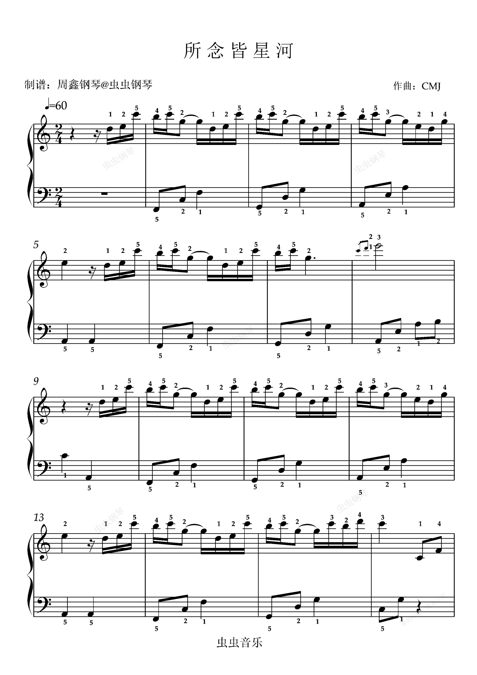 钢琴谱:《所念皆星河》C调 带指法 简单版
