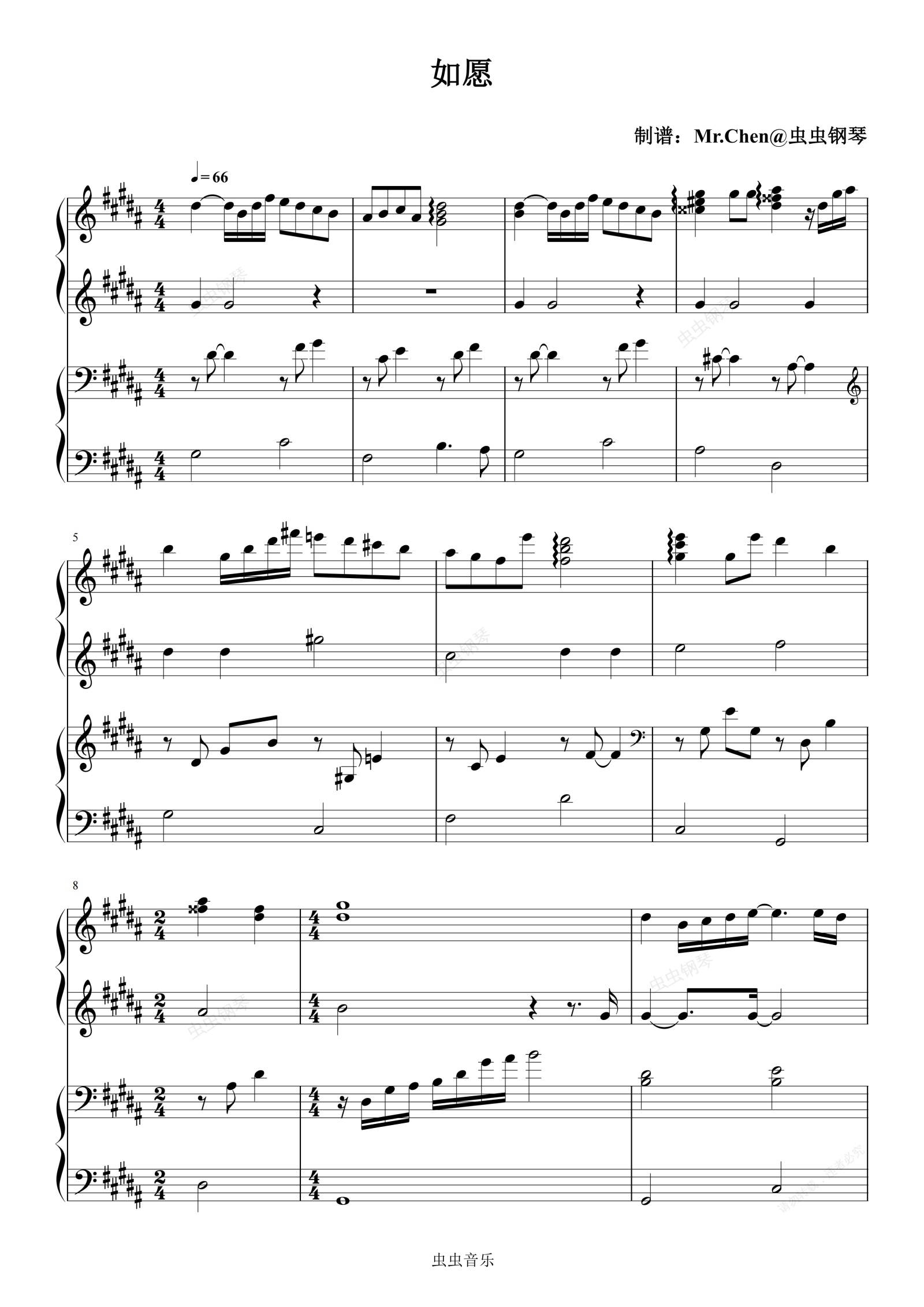 钢琴谱:如愿 (四手联弹)- 王菲 极度还原