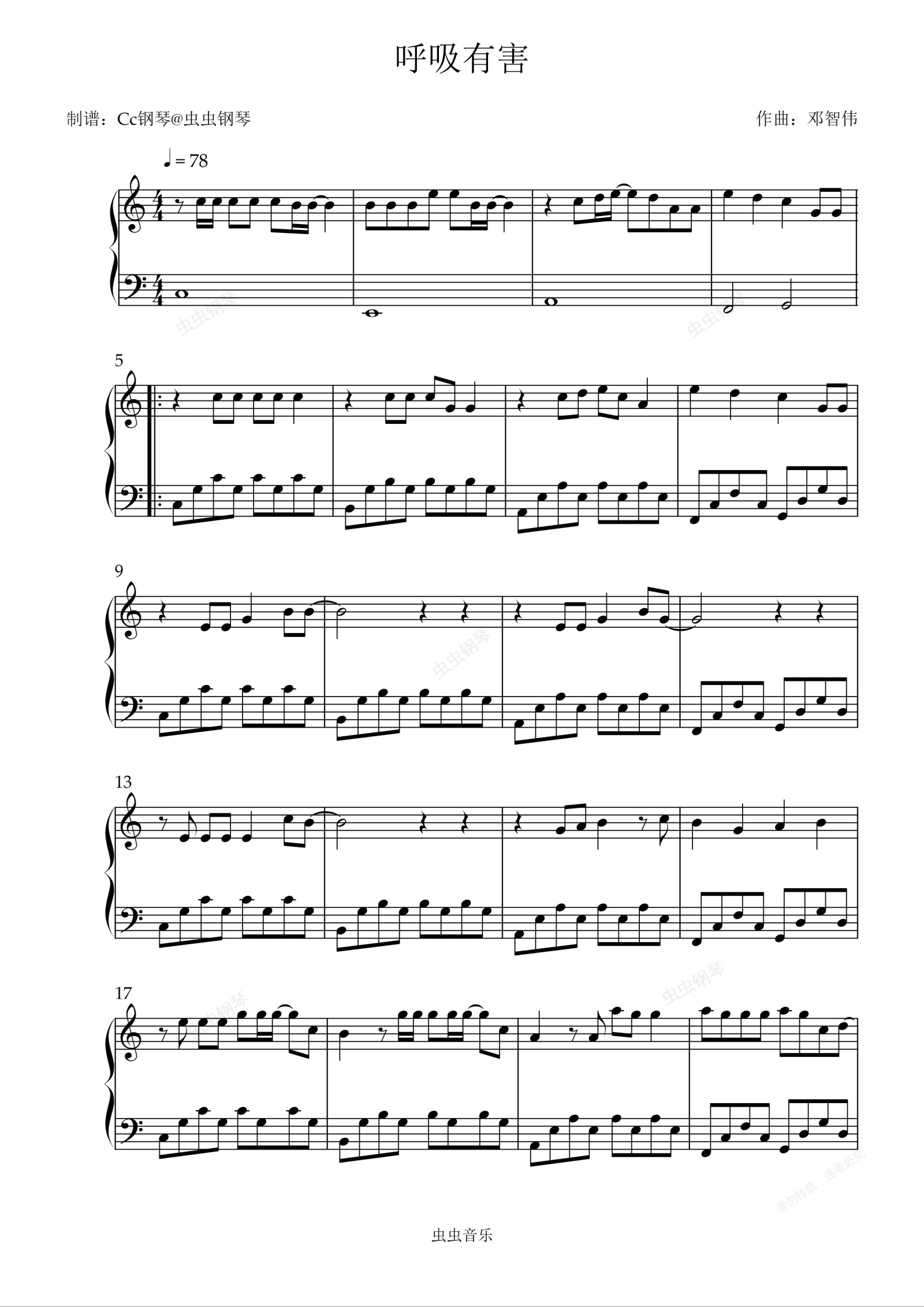 钢琴谱:呼吸有害 C调 好听易上手
