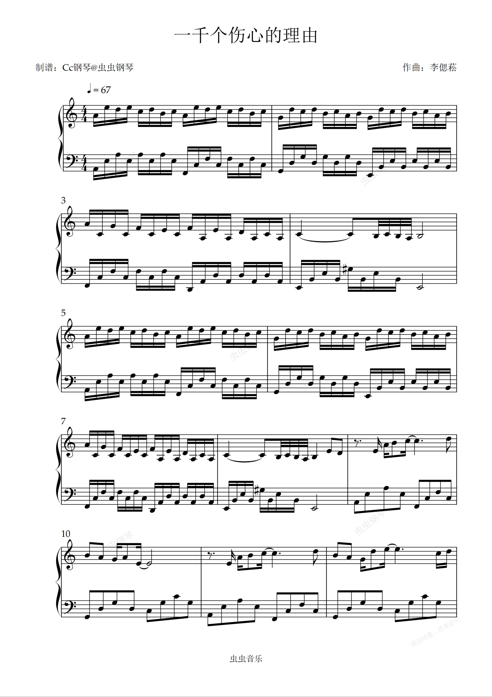 钢琴谱:一千个伤心的理由 C调 好听易上手