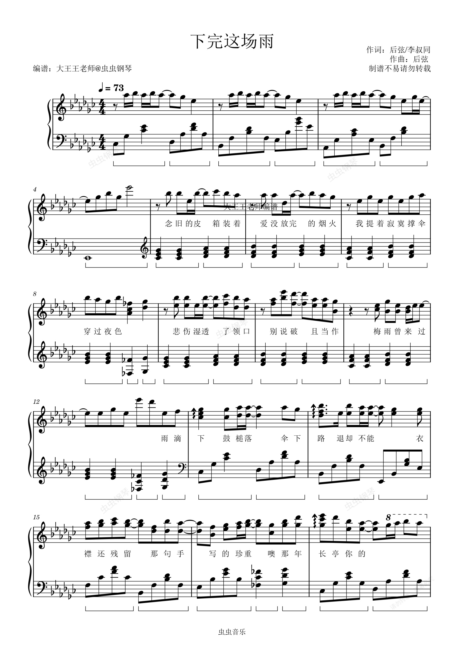 钢琴谱:下完这场雨(带歌词 后弦 我在等你等下完这场雨)