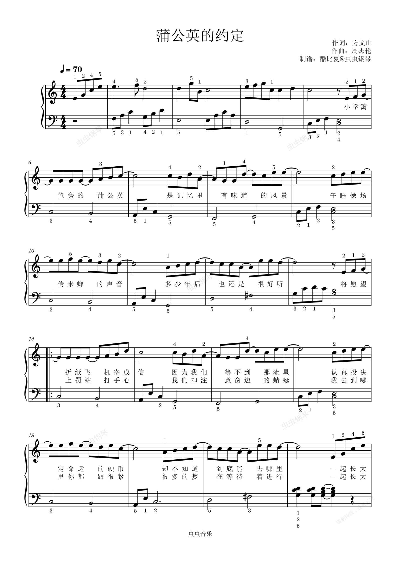 钢琴谱:蒲公英的约定(C调弹唱版)