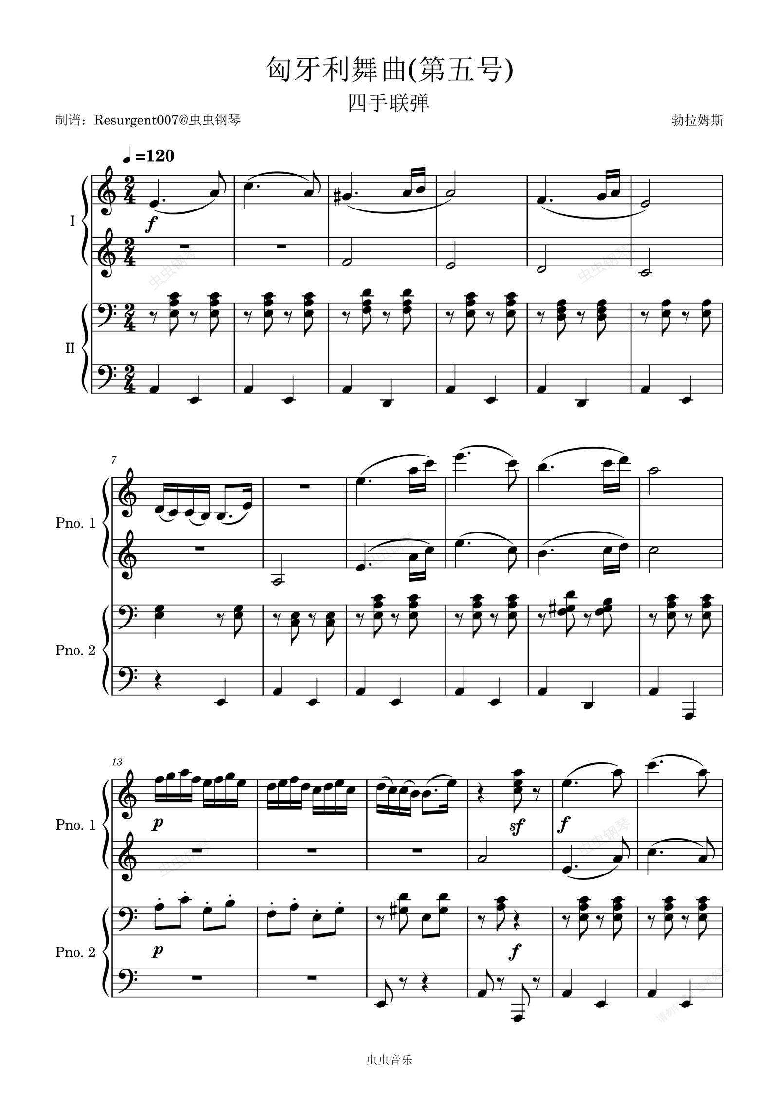 钢琴谱:匈牙利舞曲第五号(四手联弹)C调