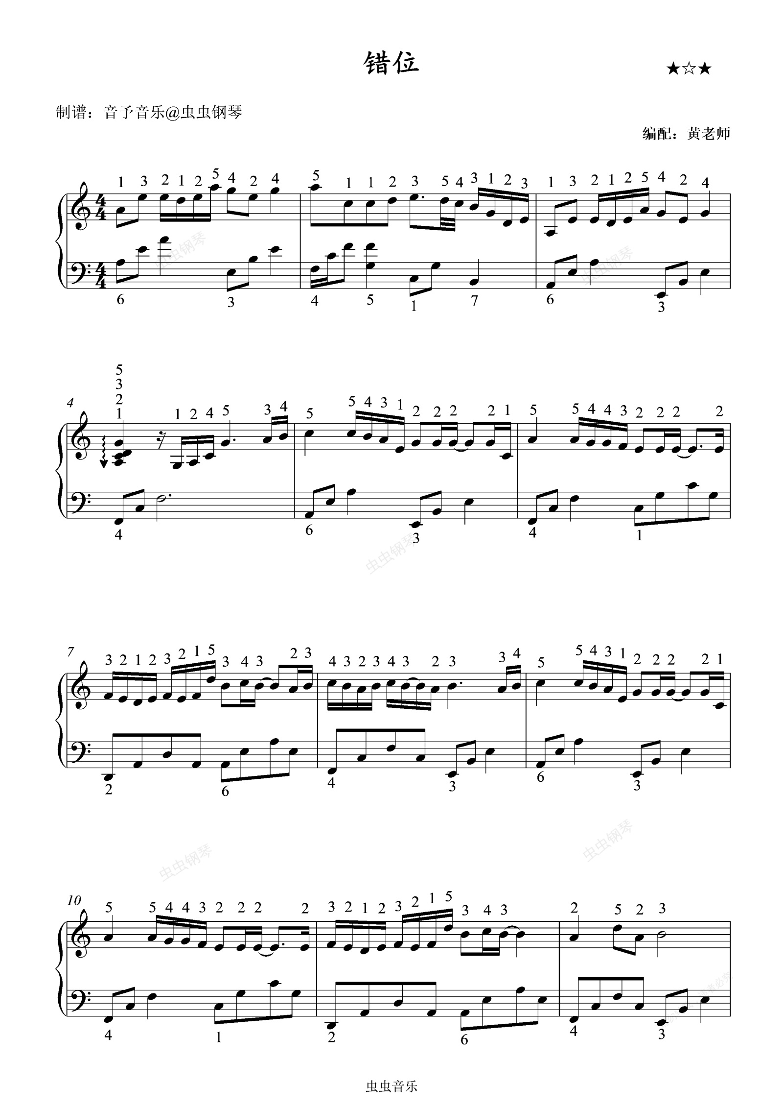 钢琴谱:错位-教学版(带指法)