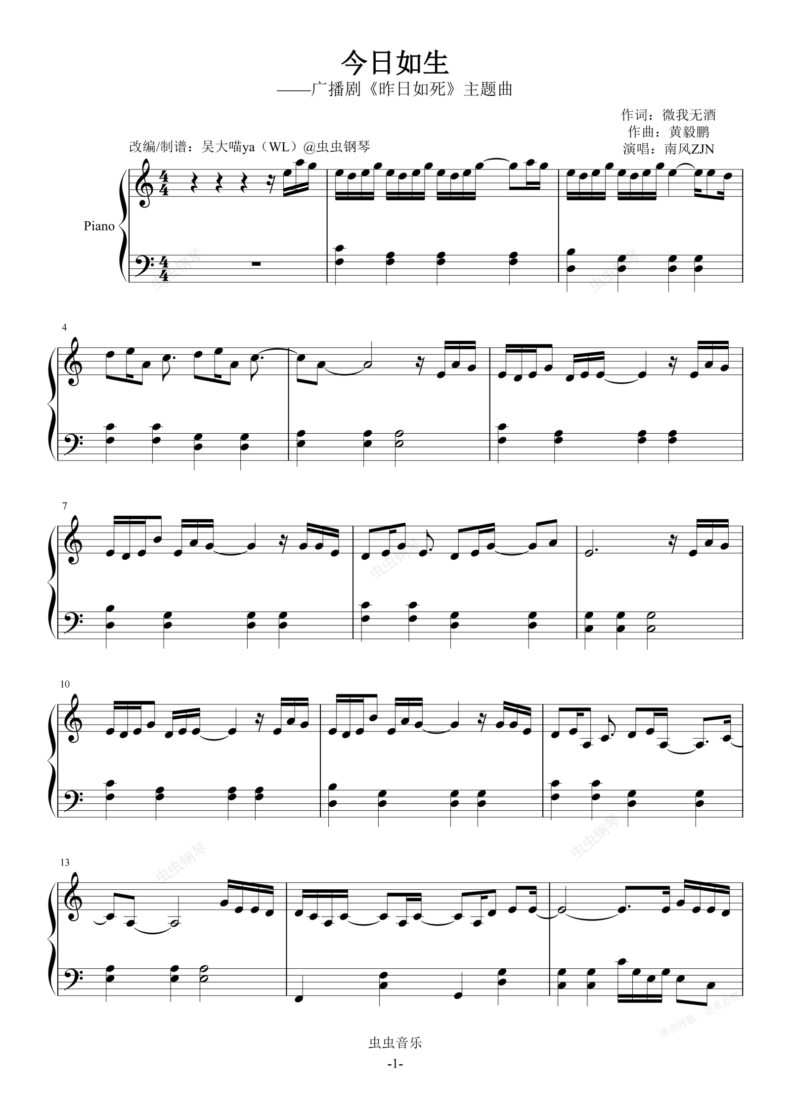 钢琴谱:今日如生C调-广播剧《昨日如死》主题曲