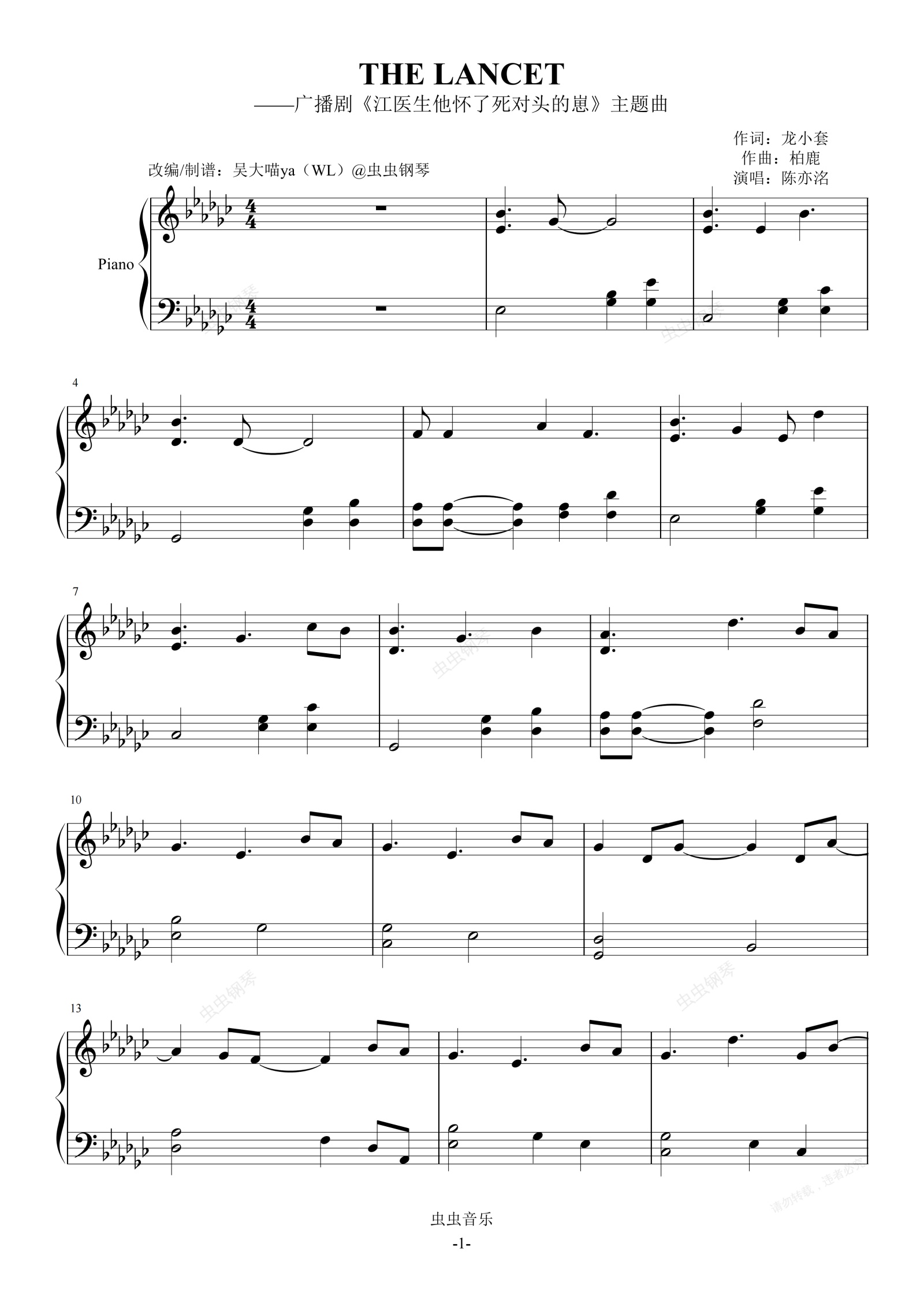 钢琴谱:THE LANCET-广播剧《江医生他怀了死对头的崽》主题曲 原调