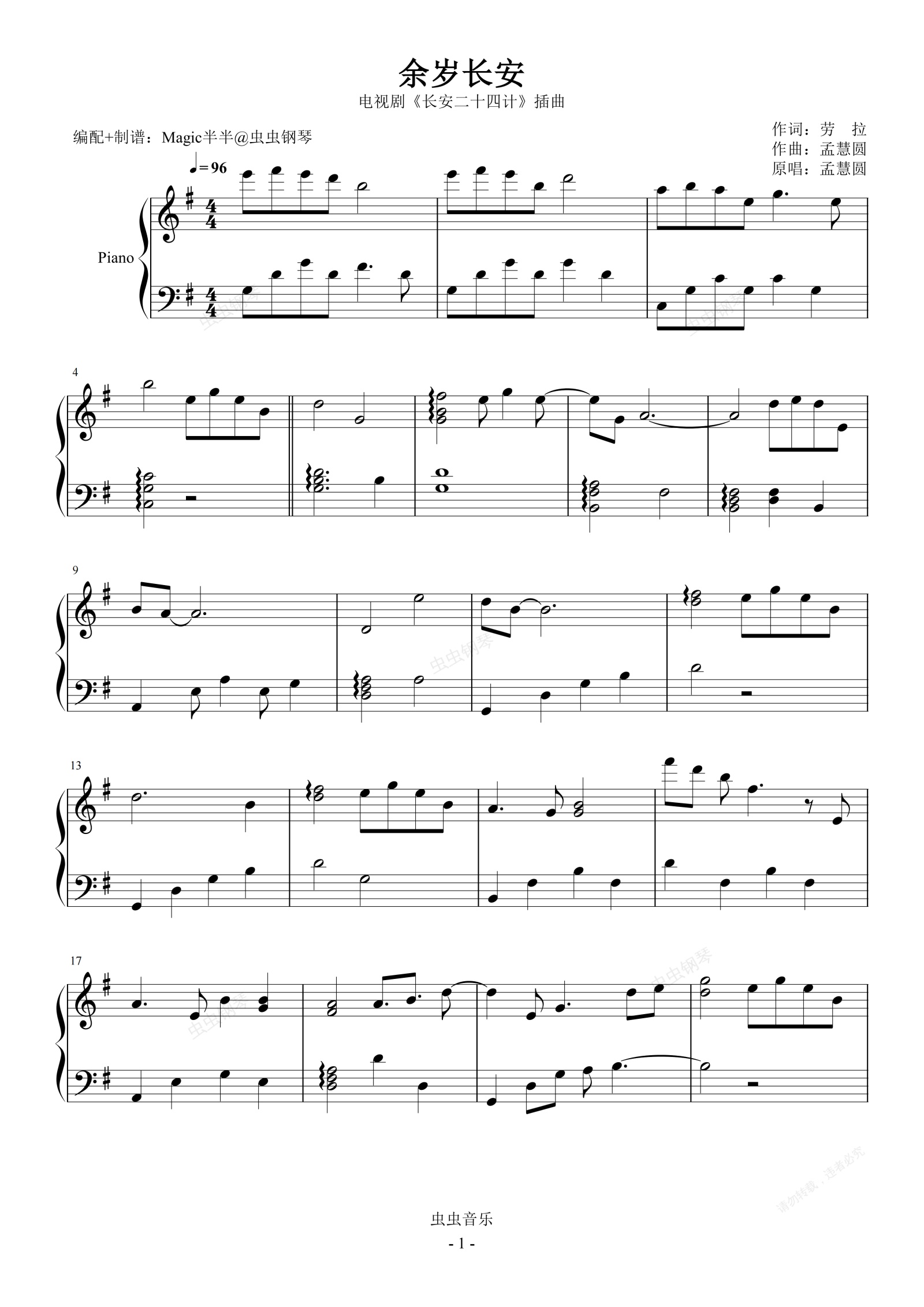 钢琴谱:余岁长安 <长安二十四计>电视剧插曲