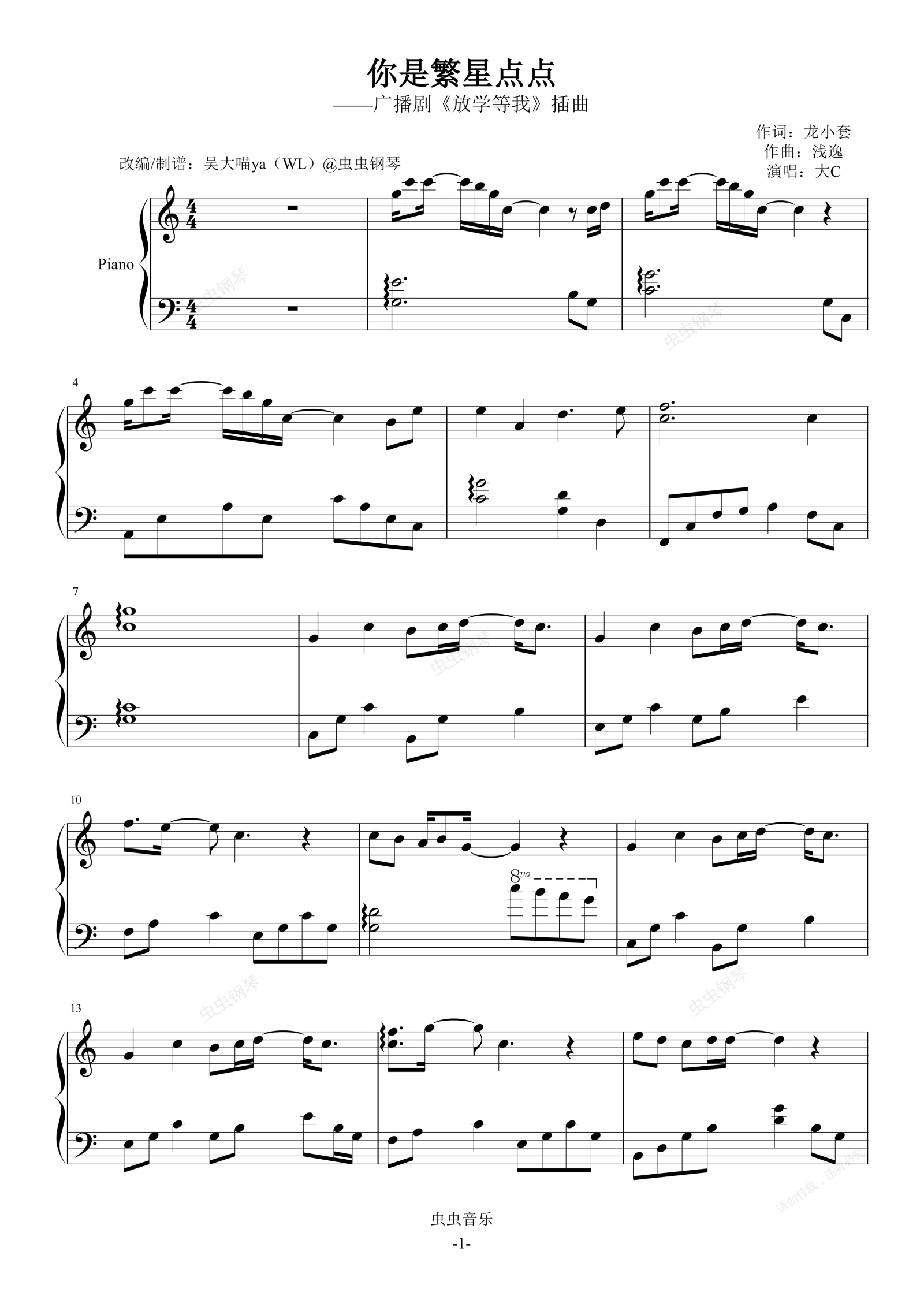 钢琴谱:你是繁星点点C调-广播剧《放学等我》插曲