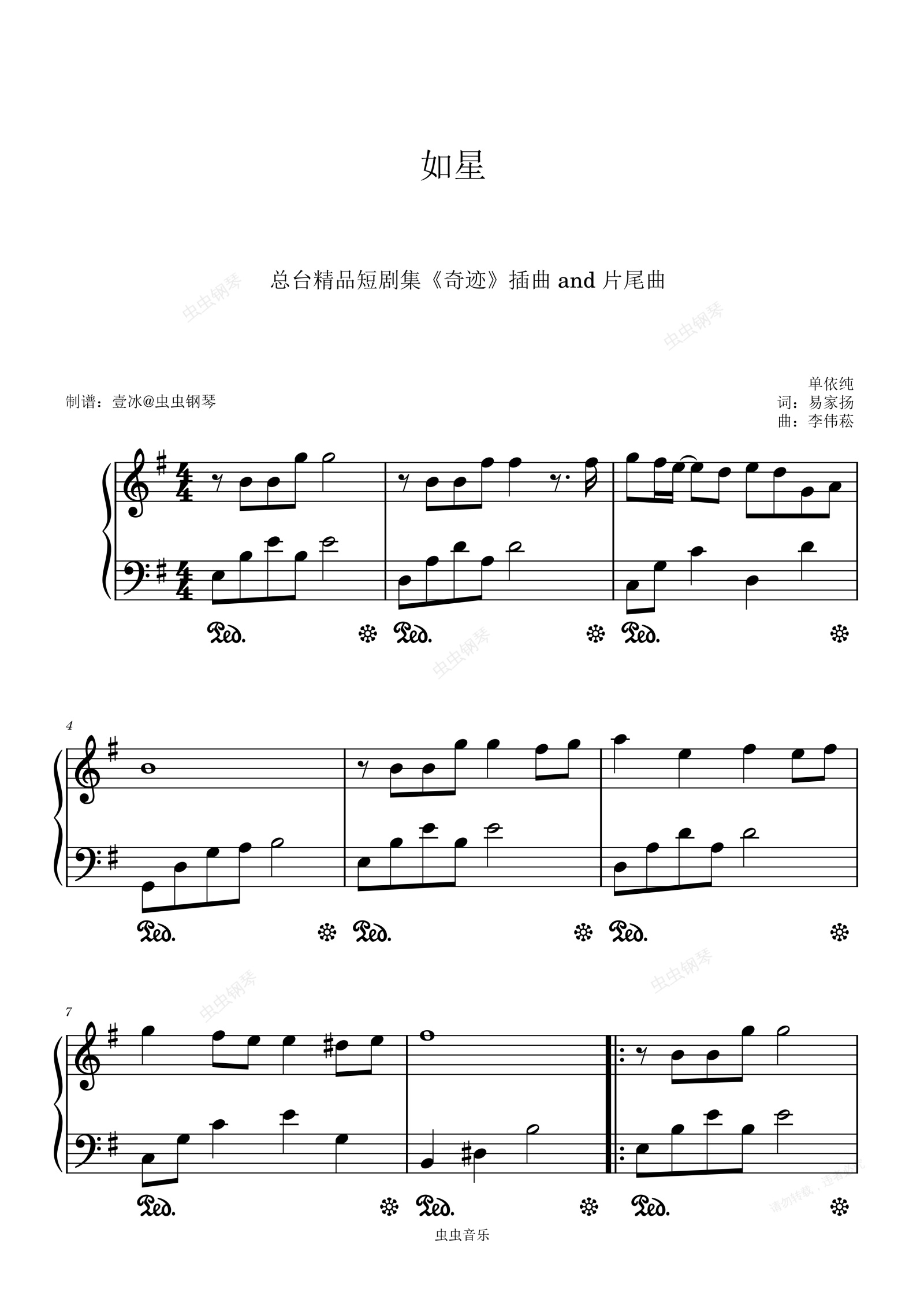 钢琴谱:如星 (总台精品短剧集《奇迹》插曲 and 片尾曲) - 原调