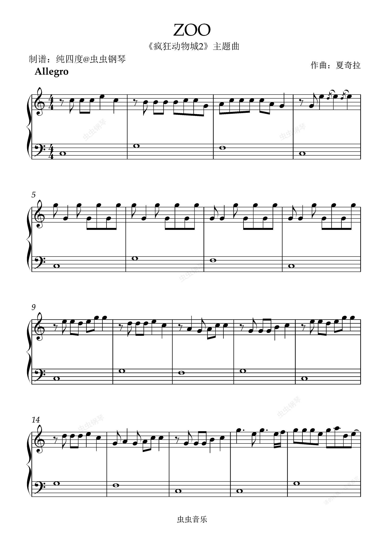 钢琴谱:Zoo《疯狂动物城2》主题曲(儿童简易版)C调