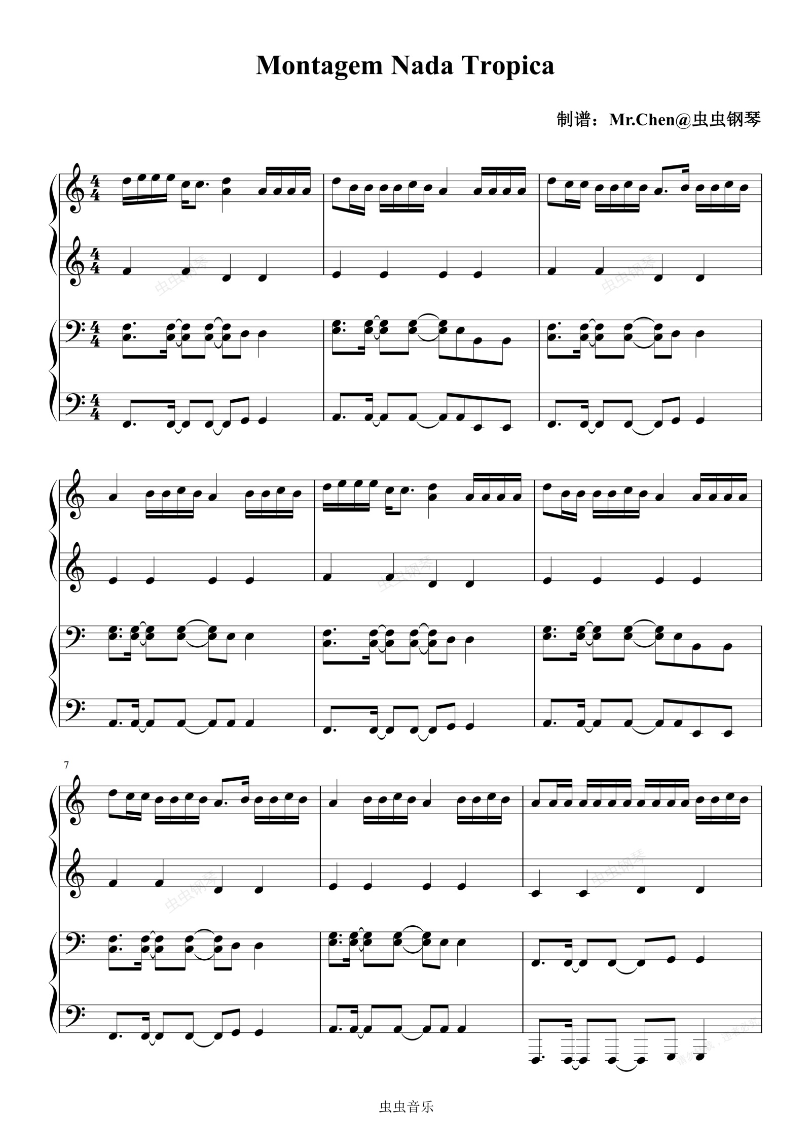 钢琴谱:Montagem Nada Tropica (四手联弹)C调 - 巴西Funk