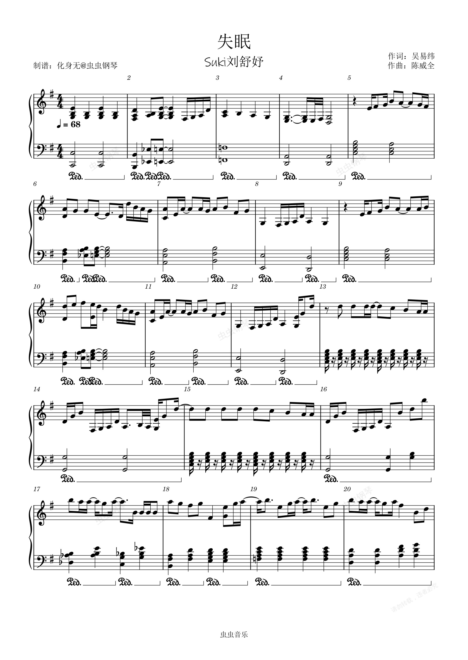 钢琴谱:失眠 - Suki刘舒妤 原调独奏版 化身无编配