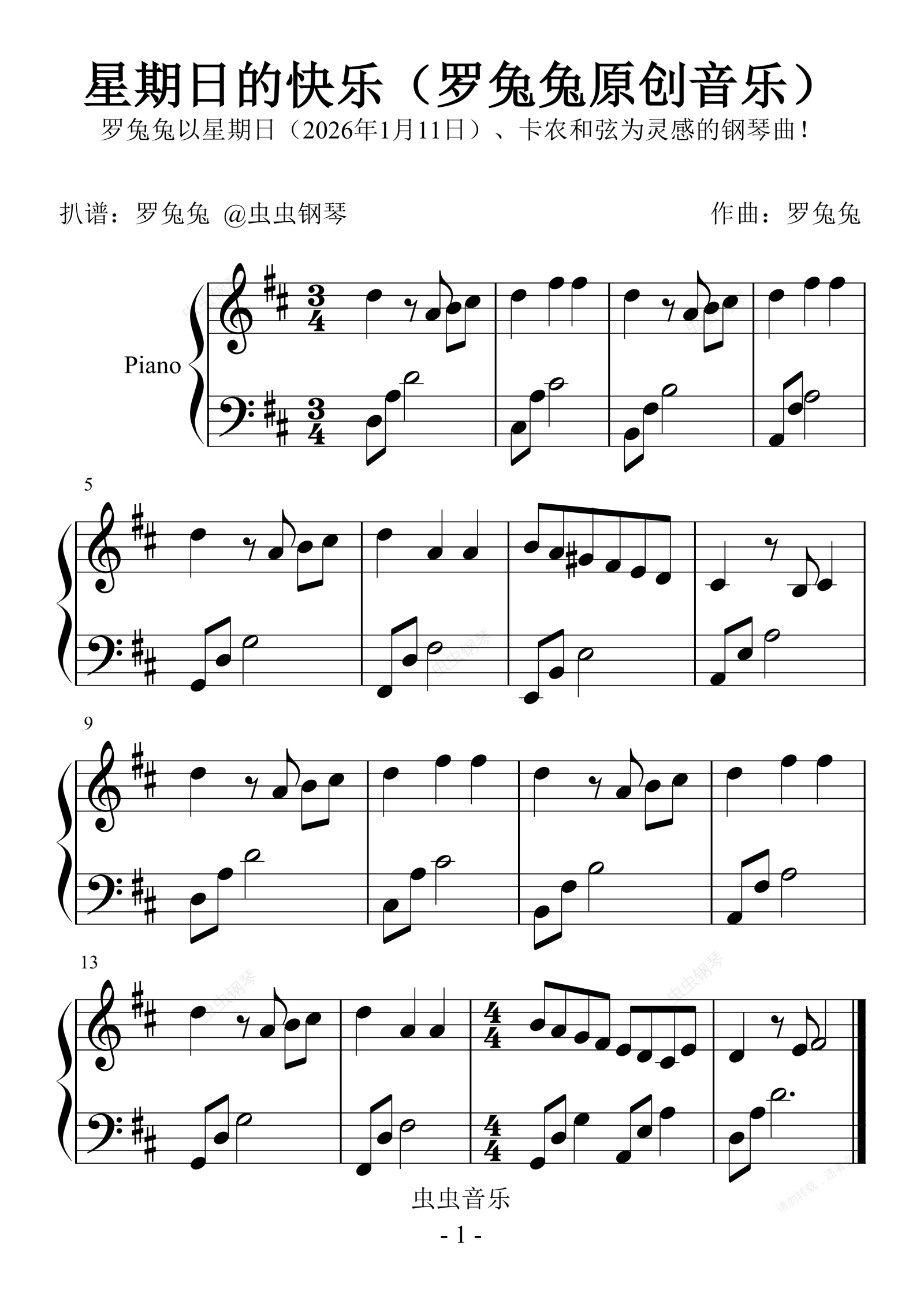 钢琴谱:星期日的快乐(罗兔兔原创音乐)