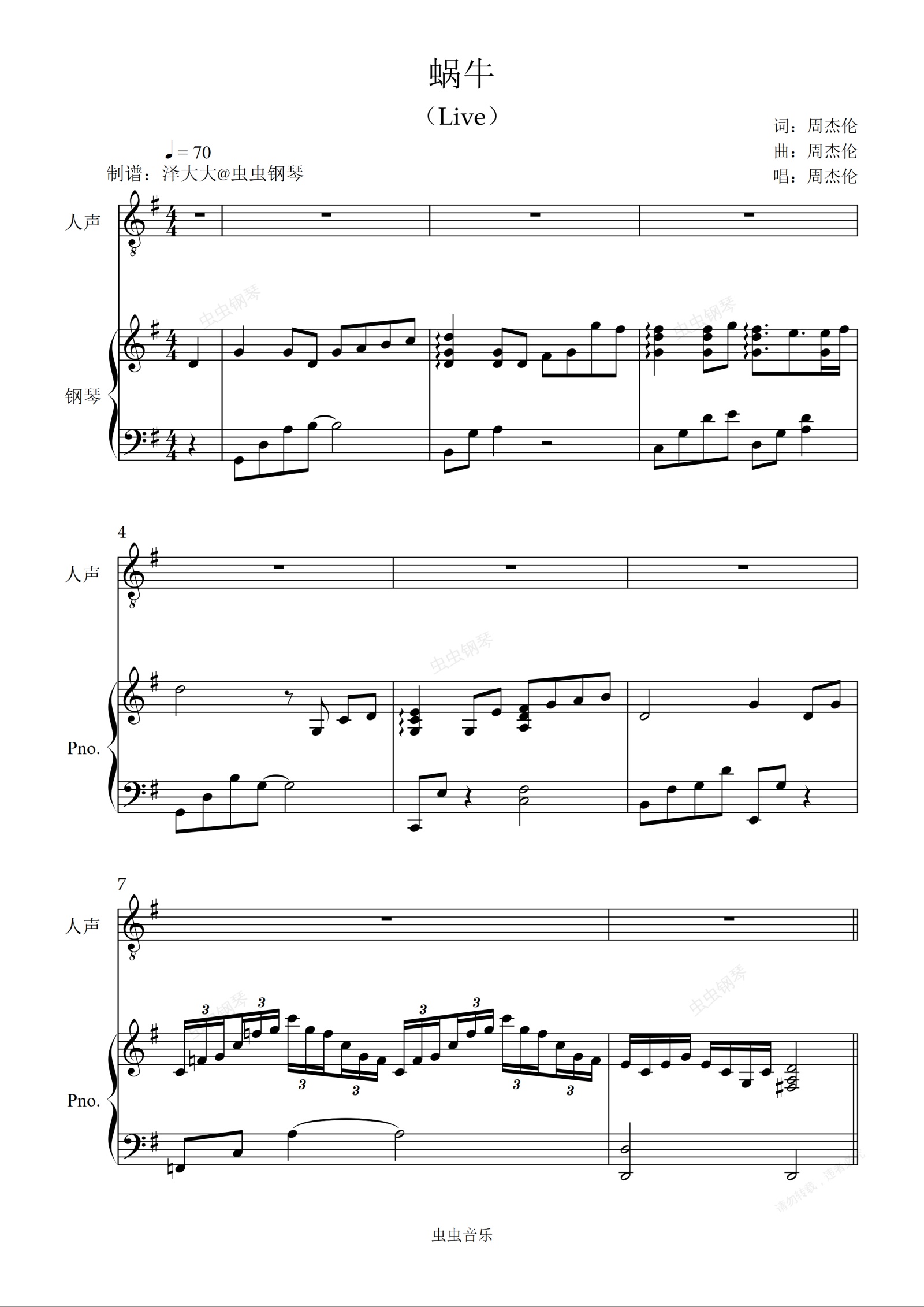 钢琴谱:蜗牛【LIve版弹唱附词】泽大大 周杰伦
