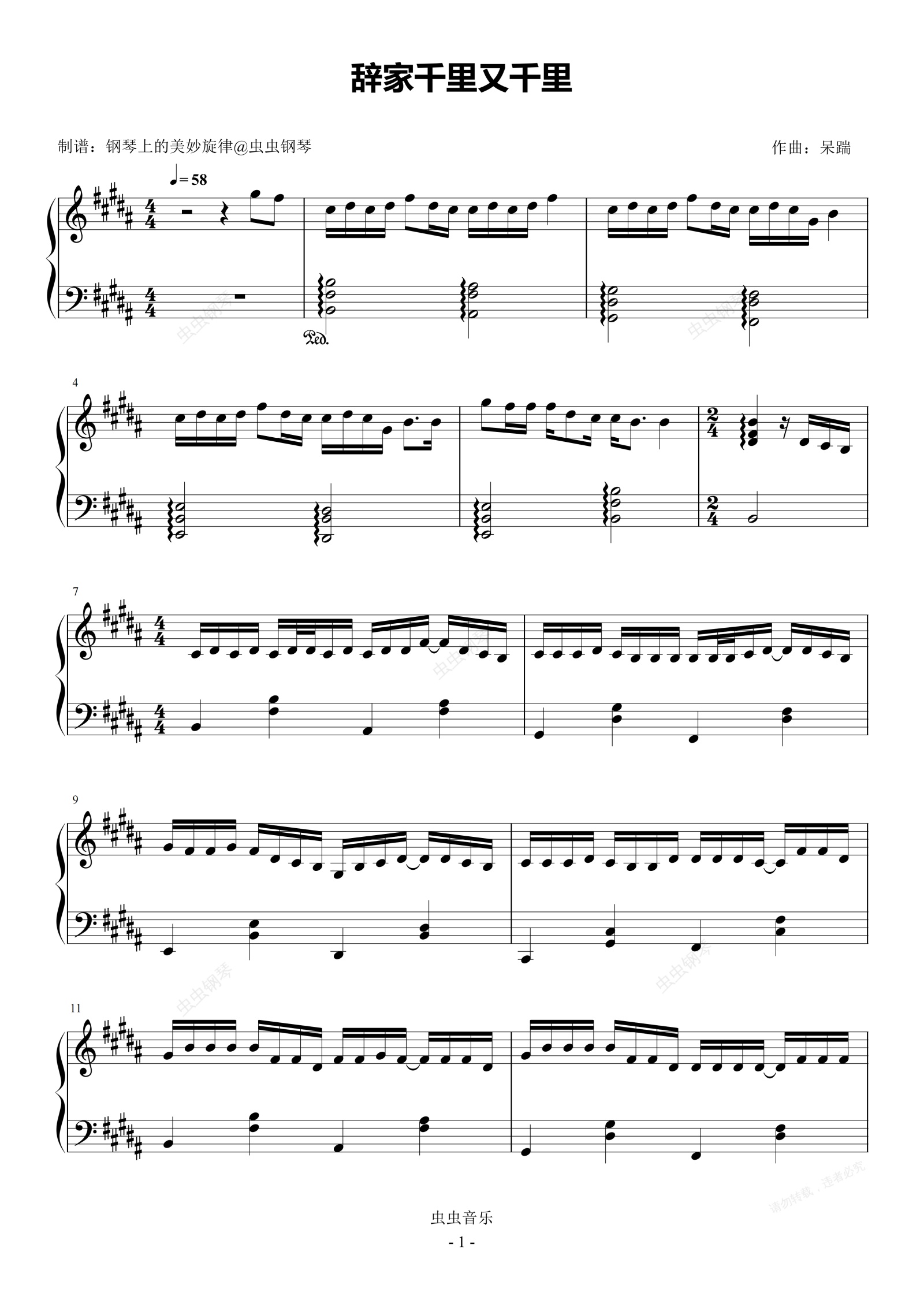 钢琴谱:辞家千里又千里 简易版 豆豆,乐岩