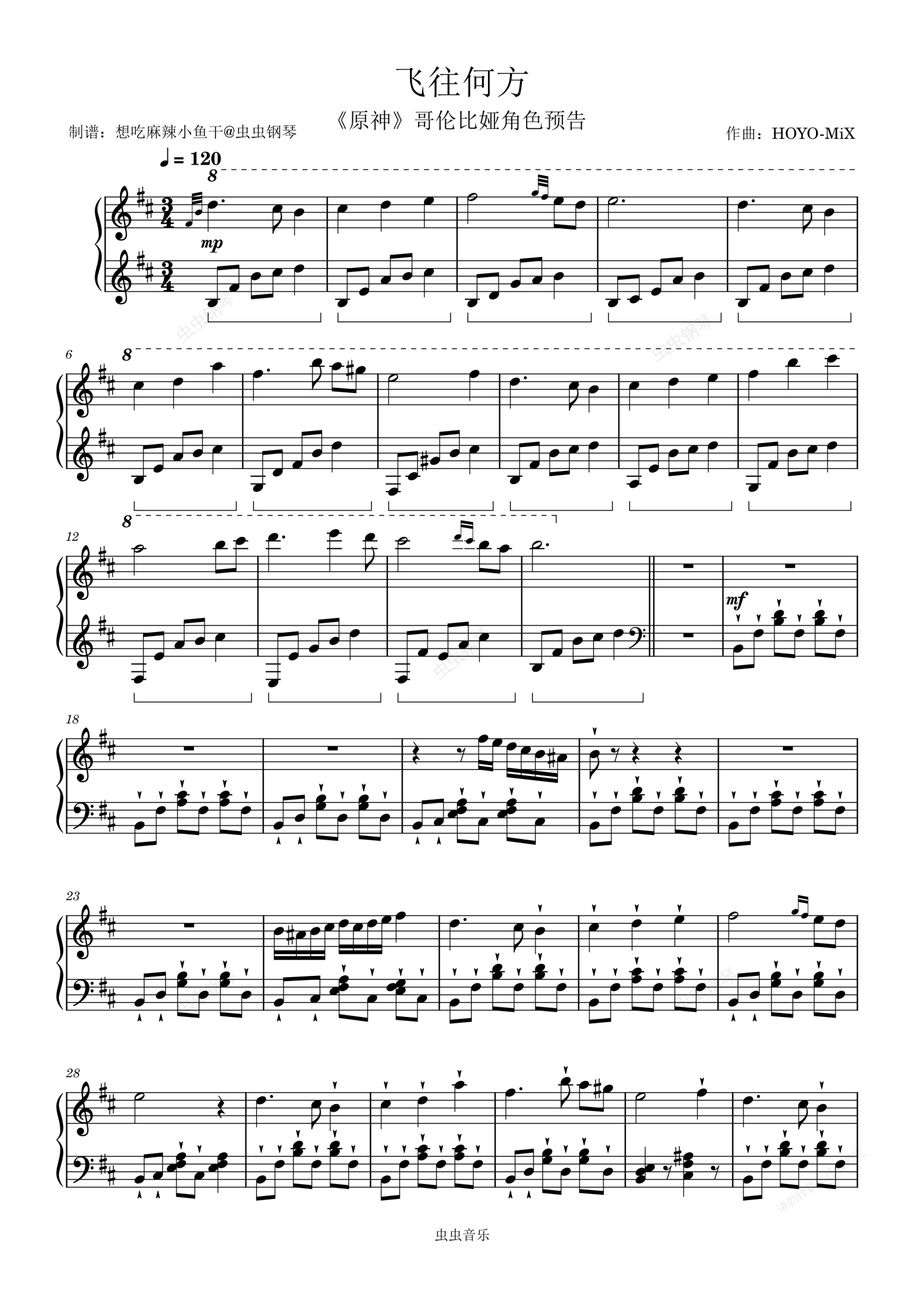 钢琴谱:飞往何方(《原神》哥伦比娅角色预告)