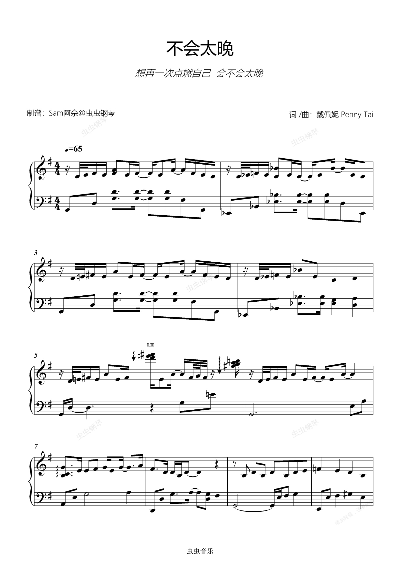 钢琴谱:原调《不会太晚》刘宇宁
