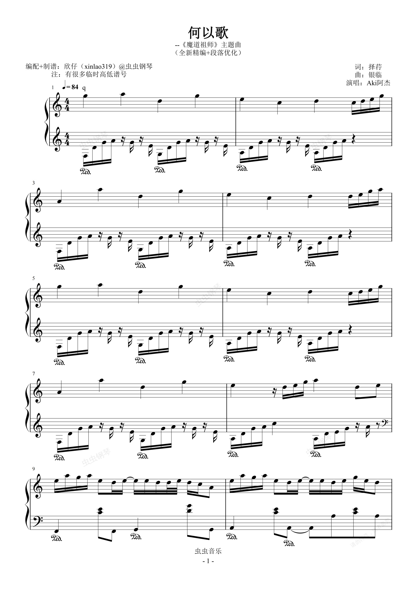 钢琴谱:何以歌(C、AKi阿杰、《魔道祖师》主题曲、段落优化)