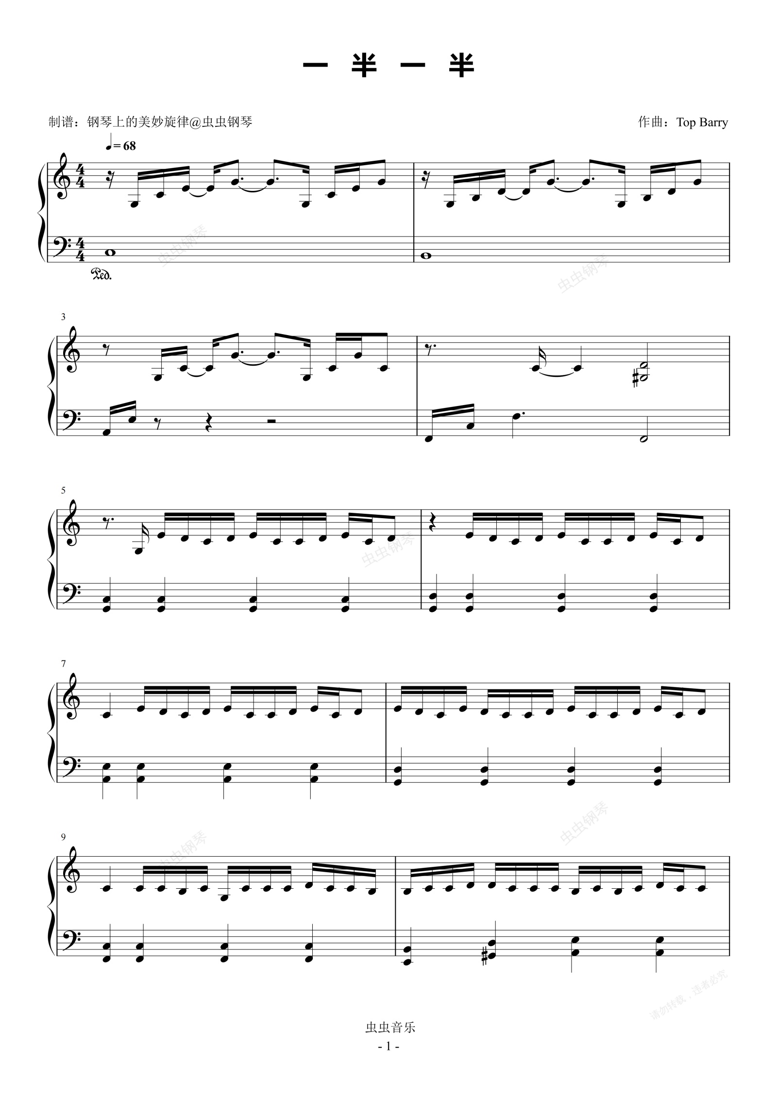 钢琴谱:一半一半 C调简易版 Top Barry