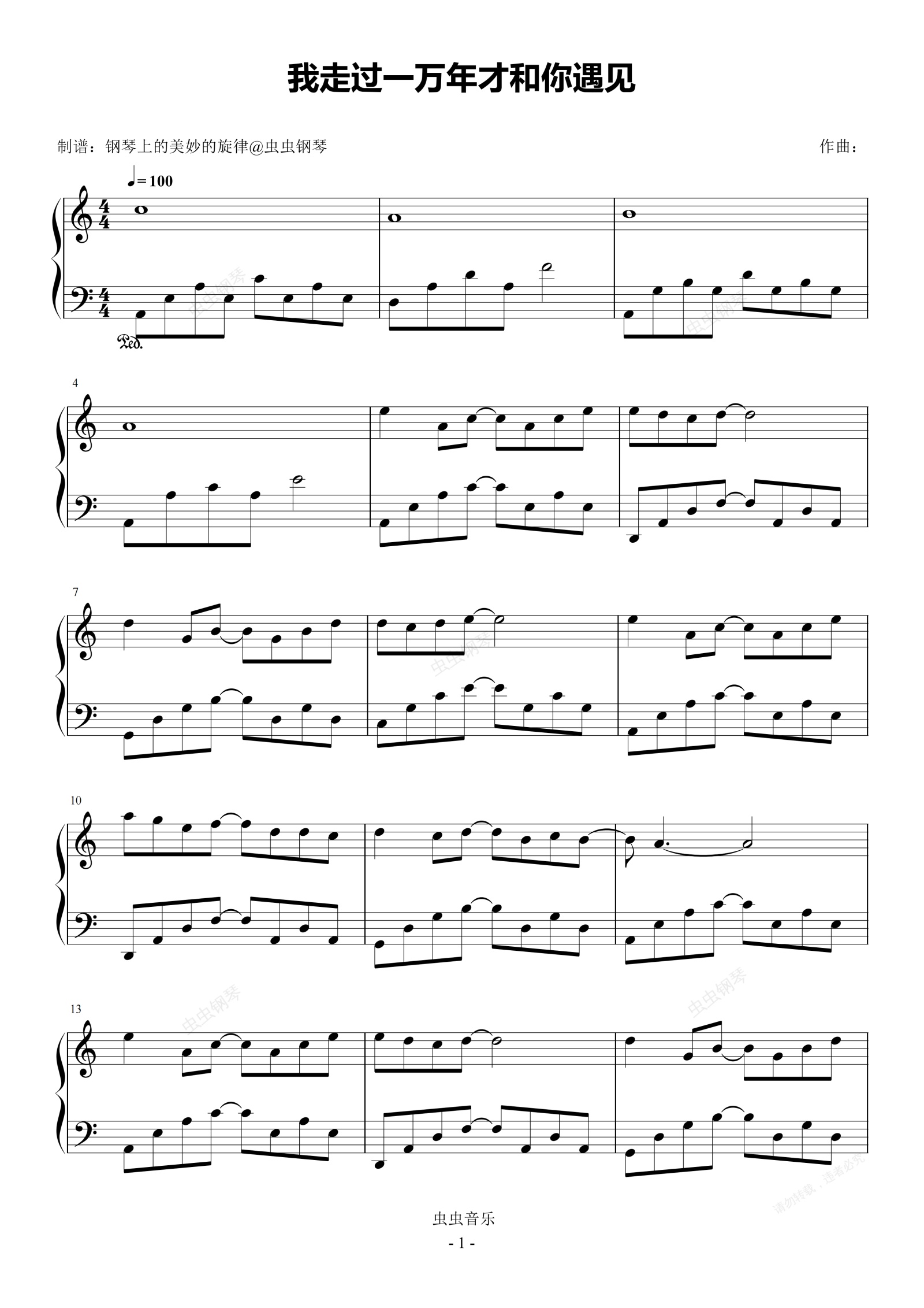 钢琴谱:我走过一万年才和你遇见 C调简易版 指尖笑