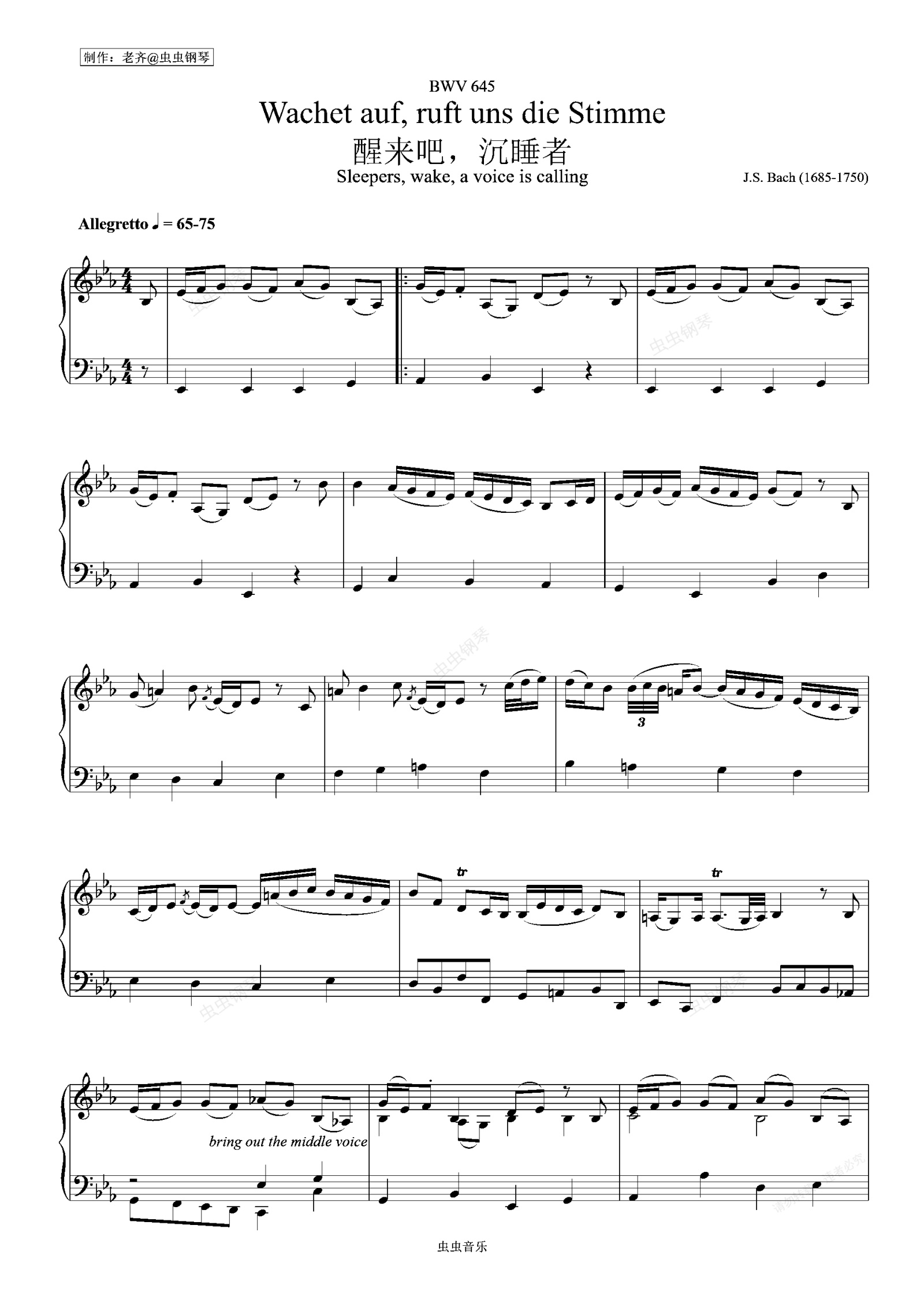 钢琴谱:【巴赫】Wachet auf, ruft uns die Stimme 醒来吧沉睡者BWV 645