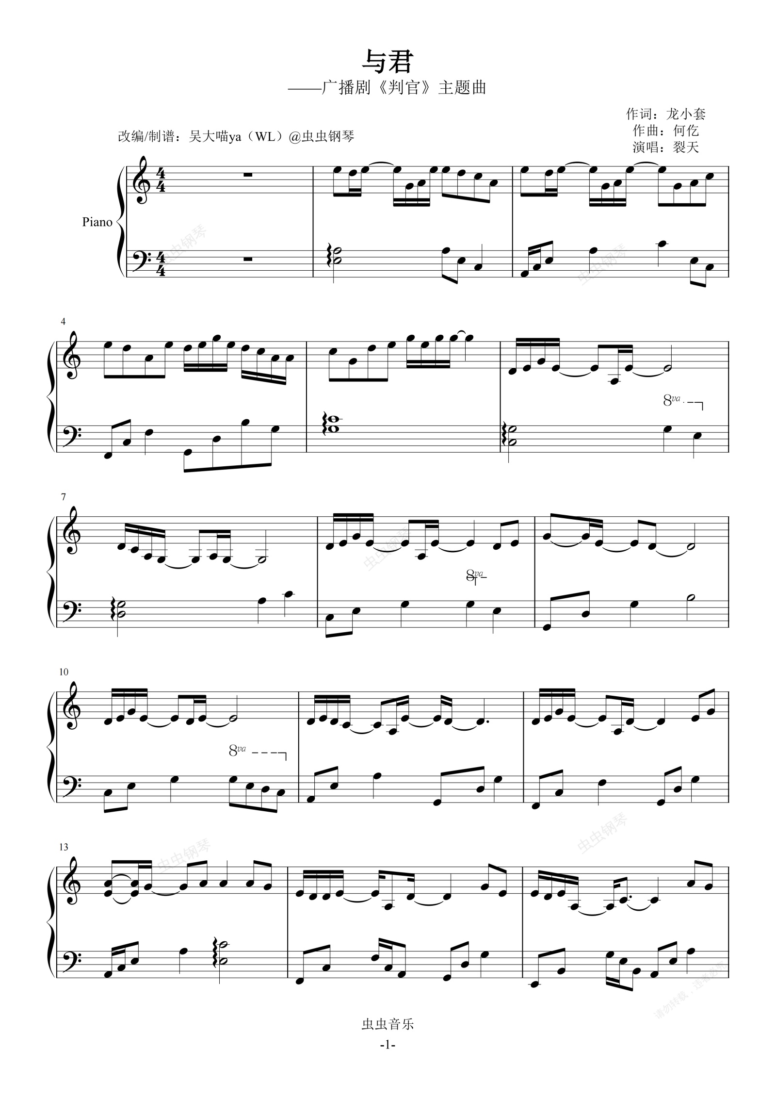 钢琴谱:与君C调-广播剧《判官》主题曲
