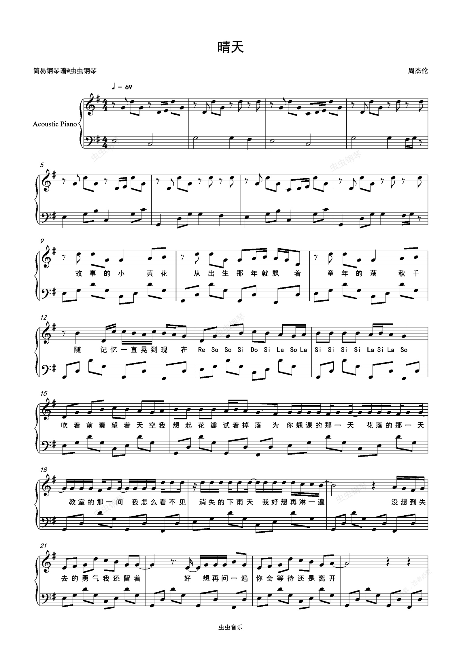 钢琴谱:晴天-周杰伦 G调独奏