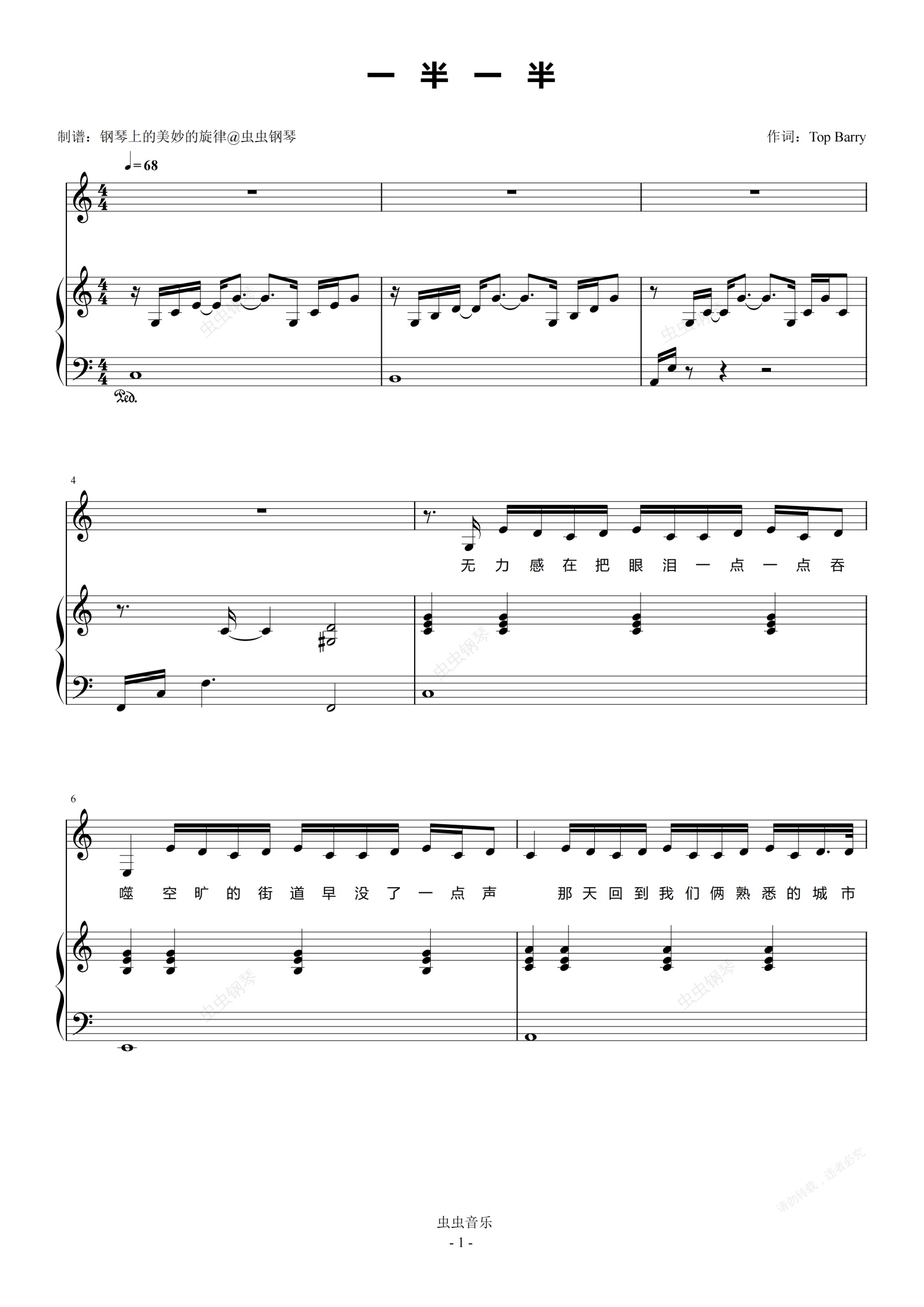钢琴谱:一半一半 C调简易钢琴弹唱伴奏 带歌词 Top Barry