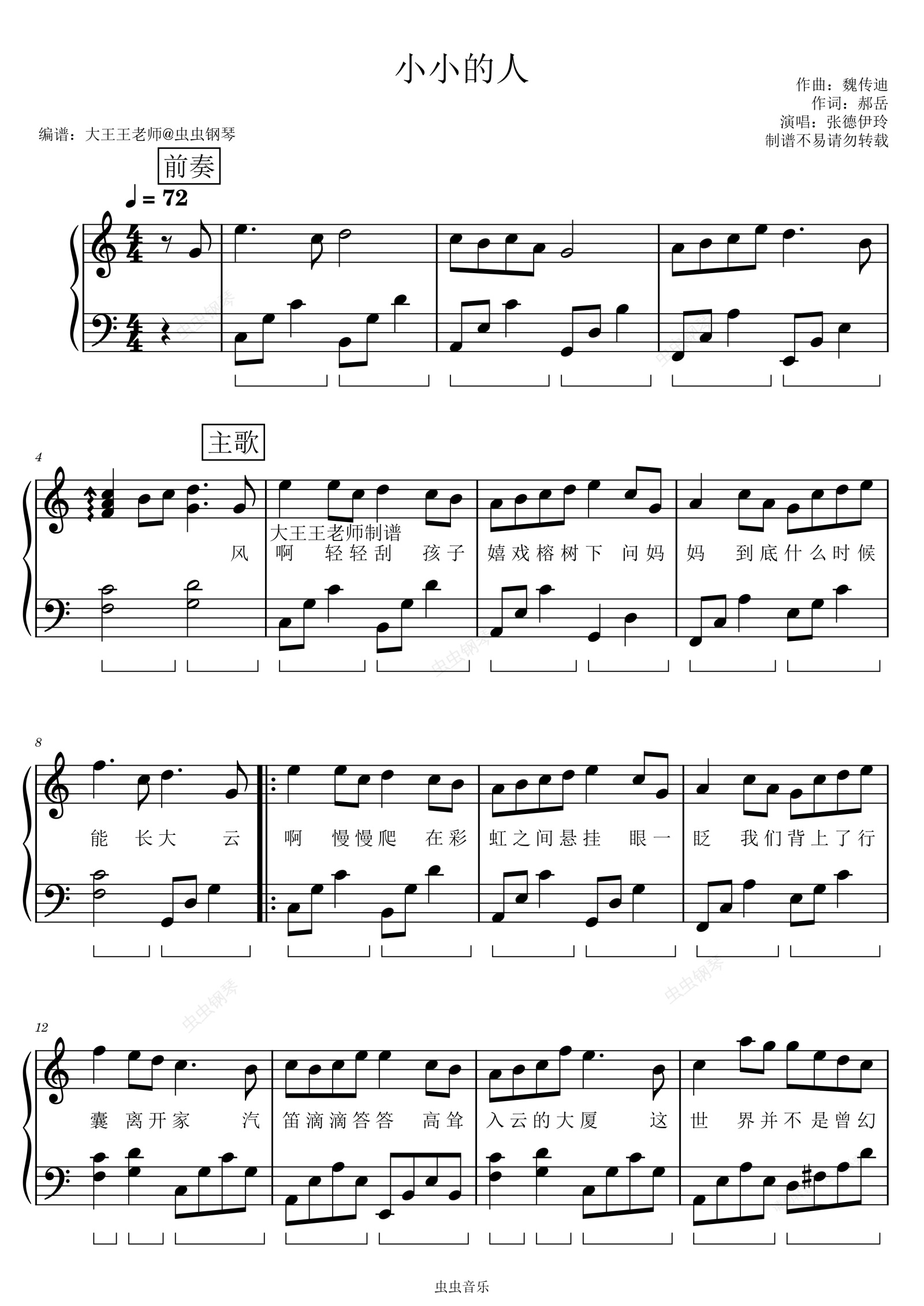 钢琴谱:小小的人(带歌词简单版张德伊玲)
