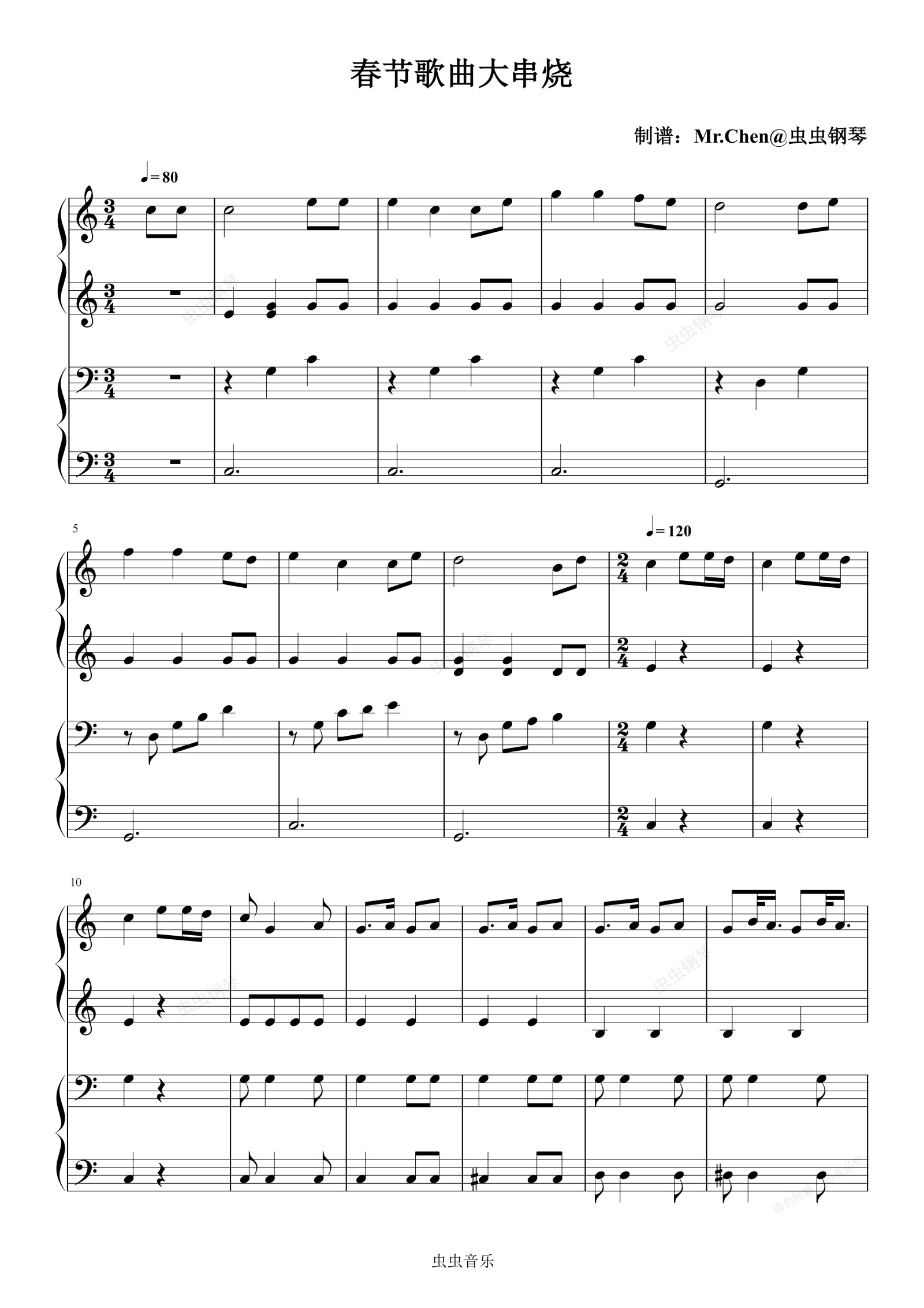 钢琴谱:春节歌曲大串烧 (四手联弹)- 春节必弹 全C调