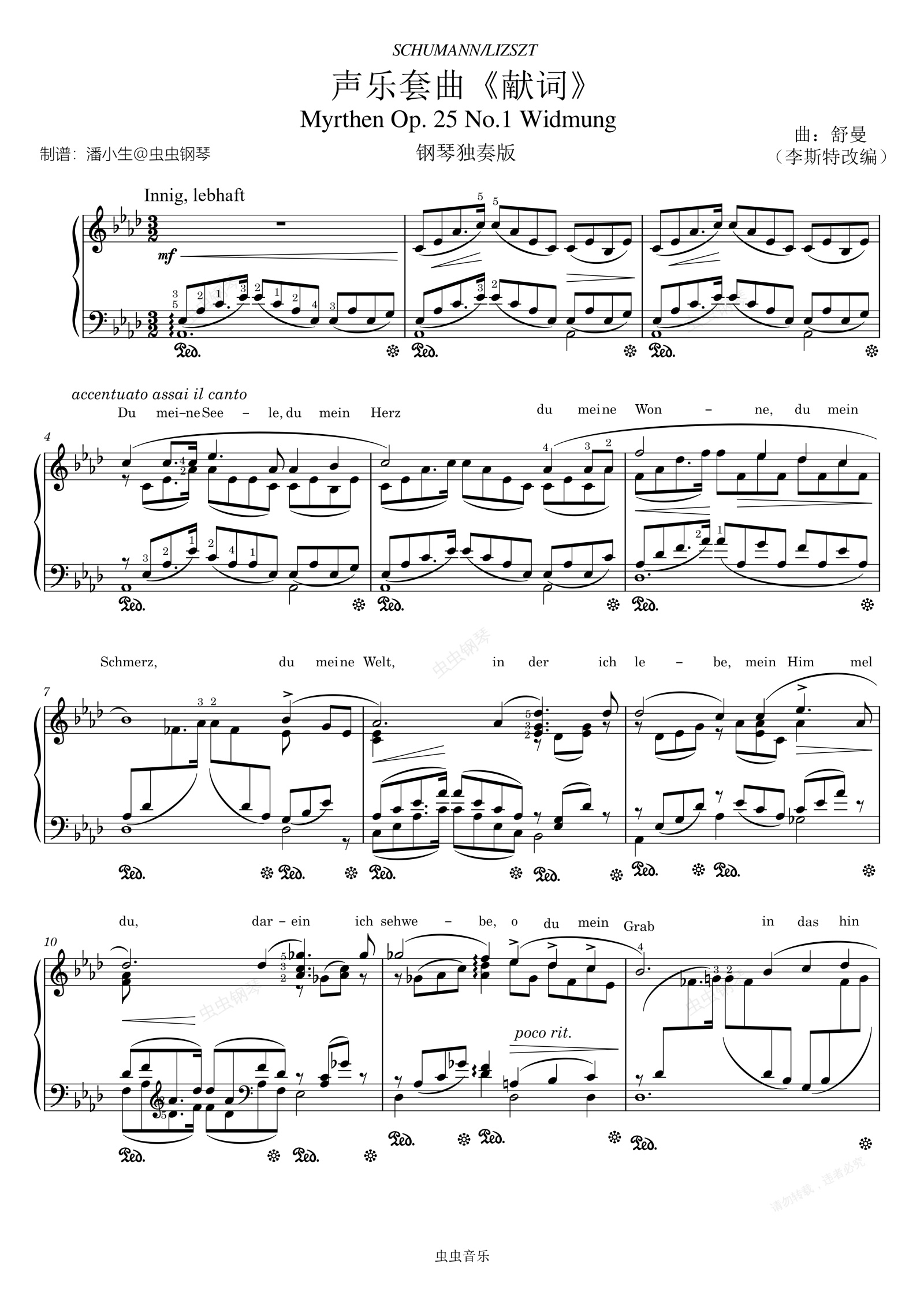 舒曼 声乐套曲《献词》 Op. 25 No.1 原版 钢琴独奏 原调降A大调 含指法歌词 李斯特改编;