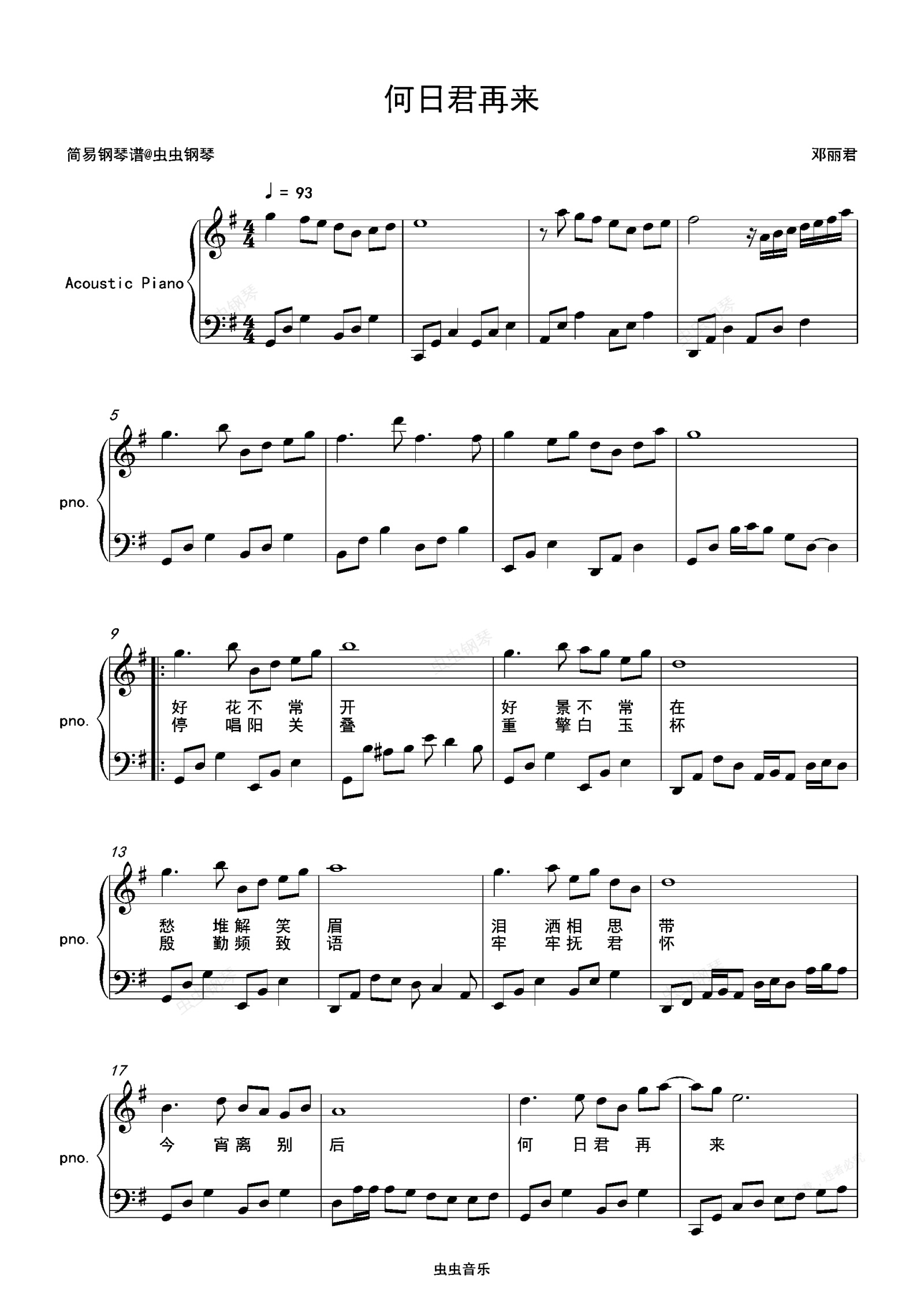 钢琴谱:何日君再来-邓丽君 G调独奏