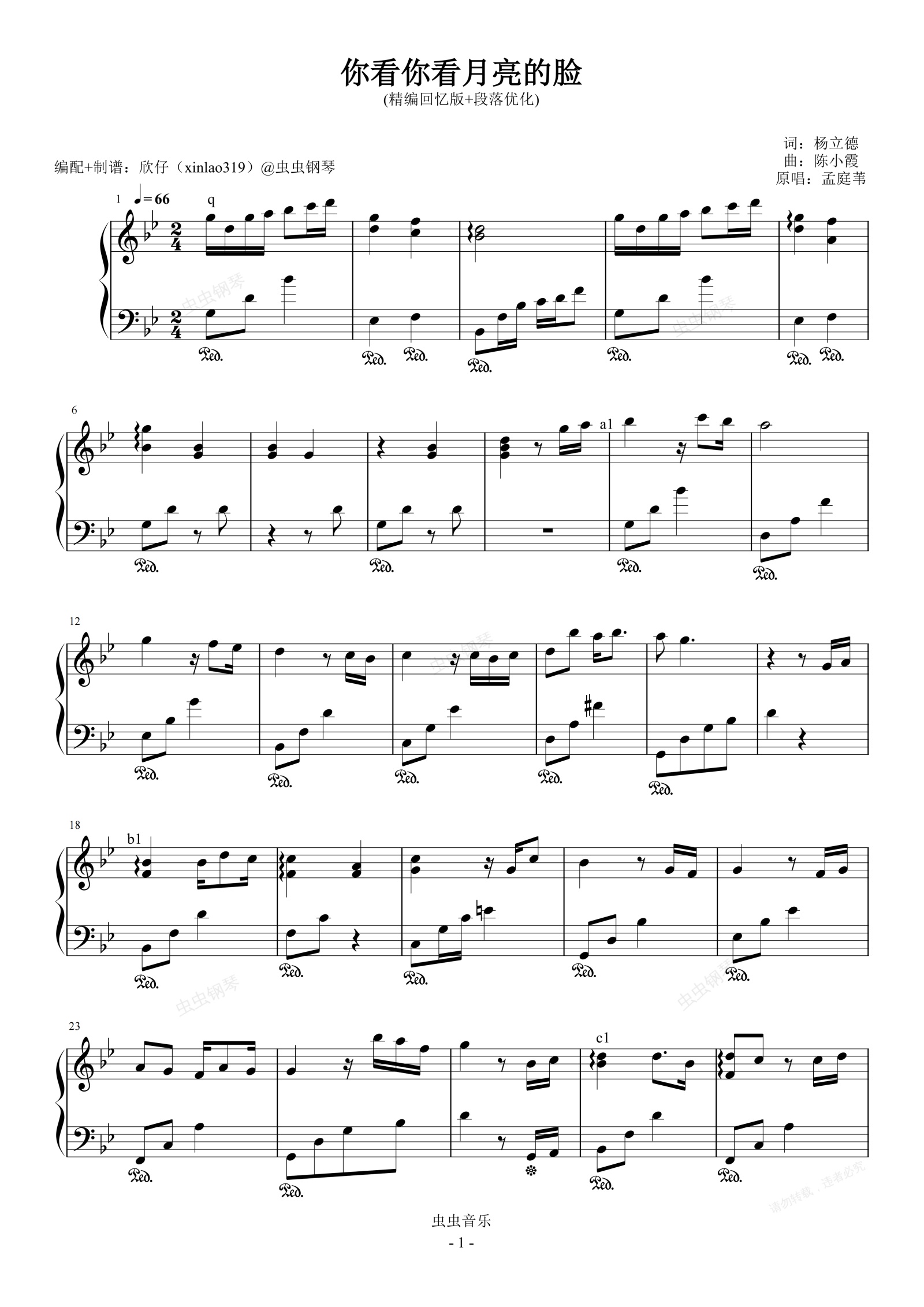 钢琴谱:你看你看月亮的脸(原调降B、孟庭苇、精编回忆+段落优化)